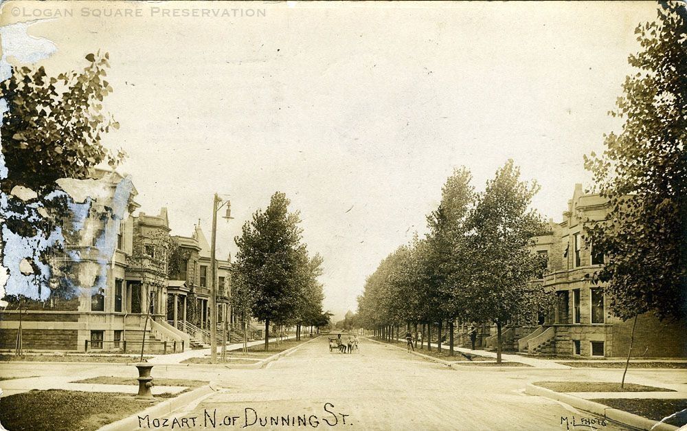 Real-photo postcard view looking north on Mozart St past intersection with Altgeld (formerly Dunning St), children on tricycle and wagon standing in middle of street, circa 1910Subject Place