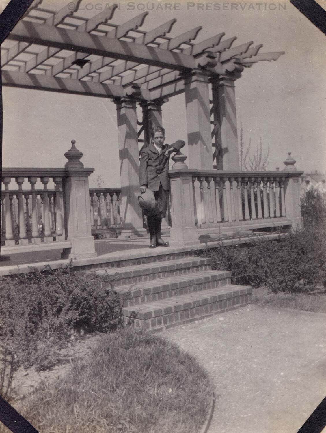 Snapshot photo of Roy Percival standing on porch of newly-built park building by architect Albert A. Schwartz, circa 1915Photograph Details