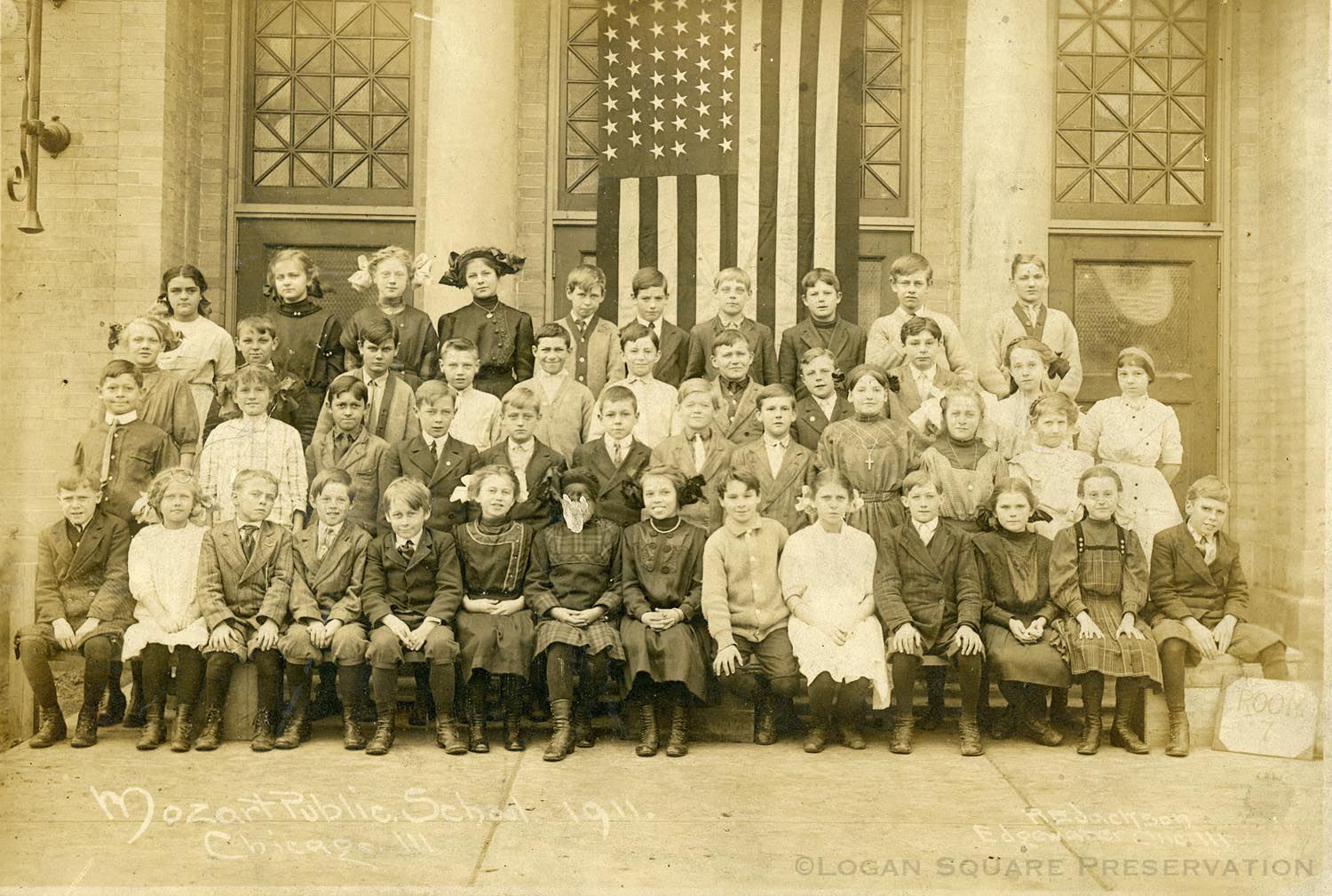 School class portrait of children from classroom 7 seated on benches in front of Mozart Elementary east entrance with large flag hanging over doorway, 1911Photograph Details