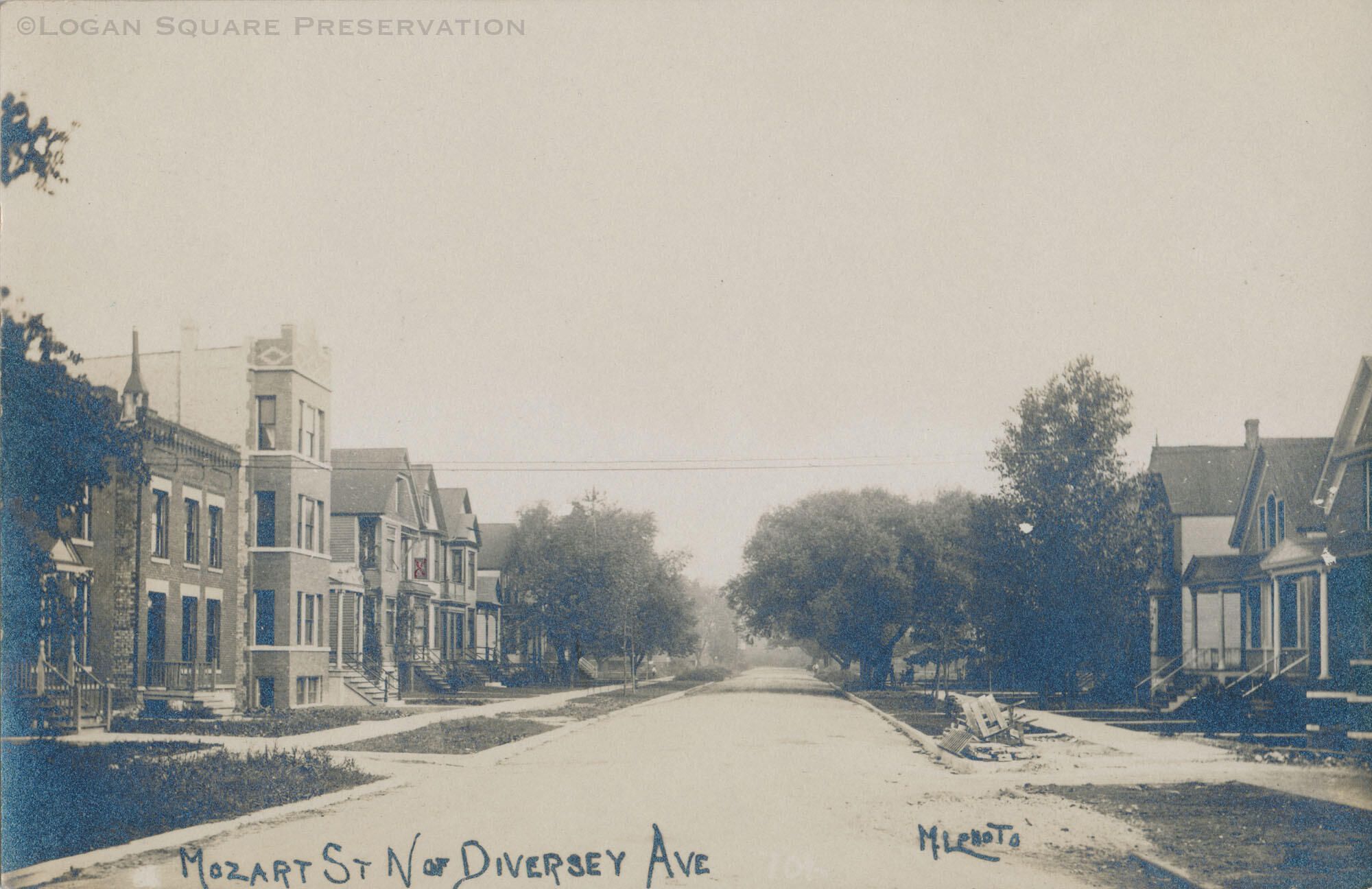 Real-photo postcard view looking north at two-flats and cottages on 2800 block of Mozart St, circa 1909Subject
