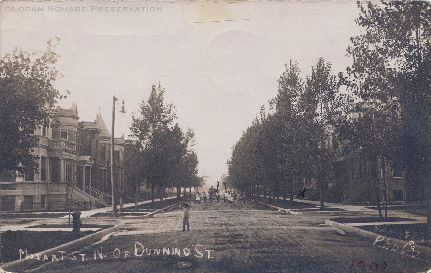 Real-photo postcard view looking north past crossing Altgeld St (formerly Dunning St) at group of children in center of dirt street with row of greystone two-flats on both sides of 2500 block of Mozart St, 1908. "X" at 2511 N. Mozart marks home of sender Paul Reichelt with lines above Reichelt children in street.Subject Person/Organization