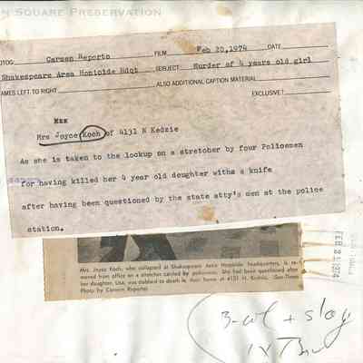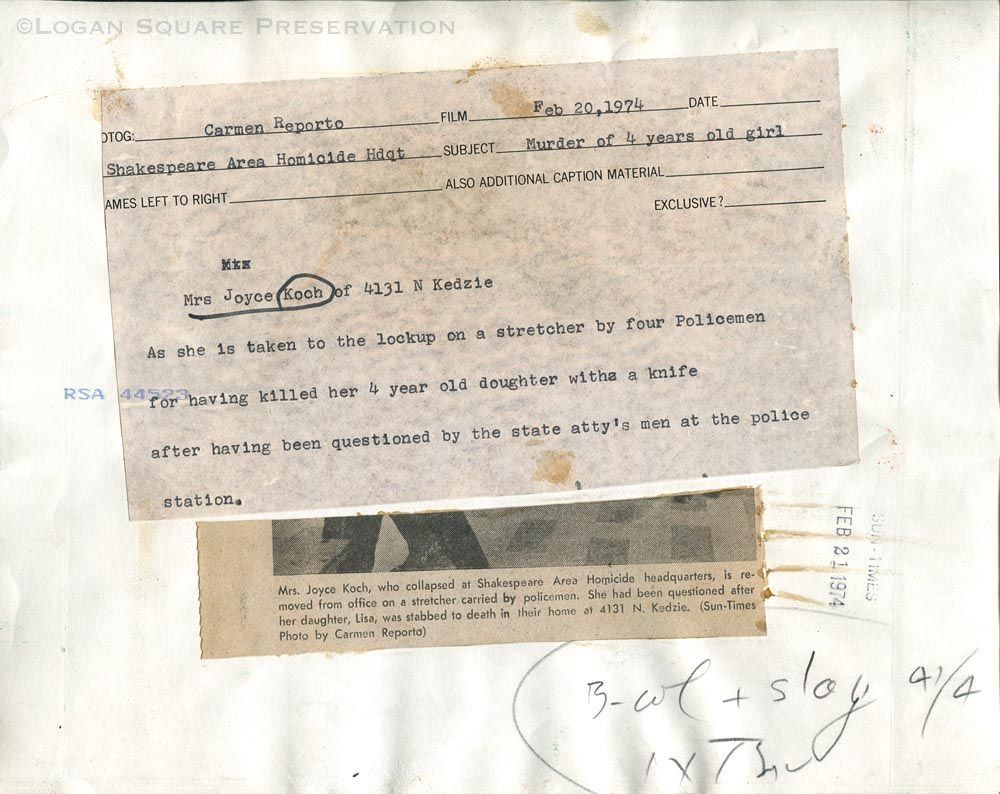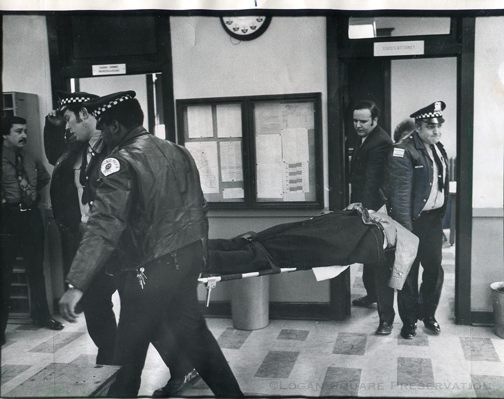 News photo of Shakespeare 14th District police officers carrying blanket-wrapped stretcher with woman who collapsed during questioning after murder of her daughter, 1974Photograph Details