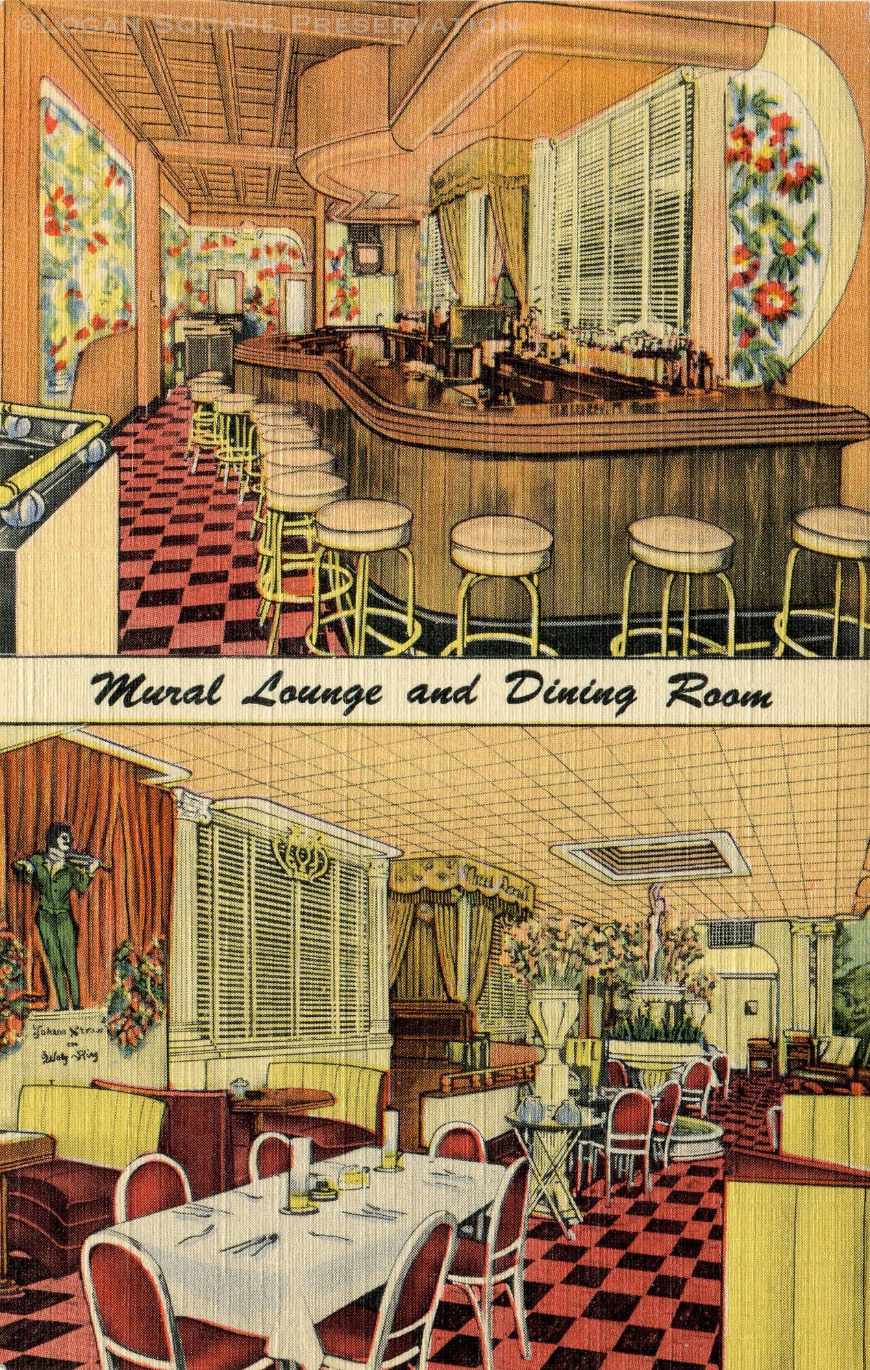 Colorized linen postcard with montage views of stools around bar in lounge and tables in booths in restaurant dining room, circa 1950. Curt Teich card #0C-H1283Subject