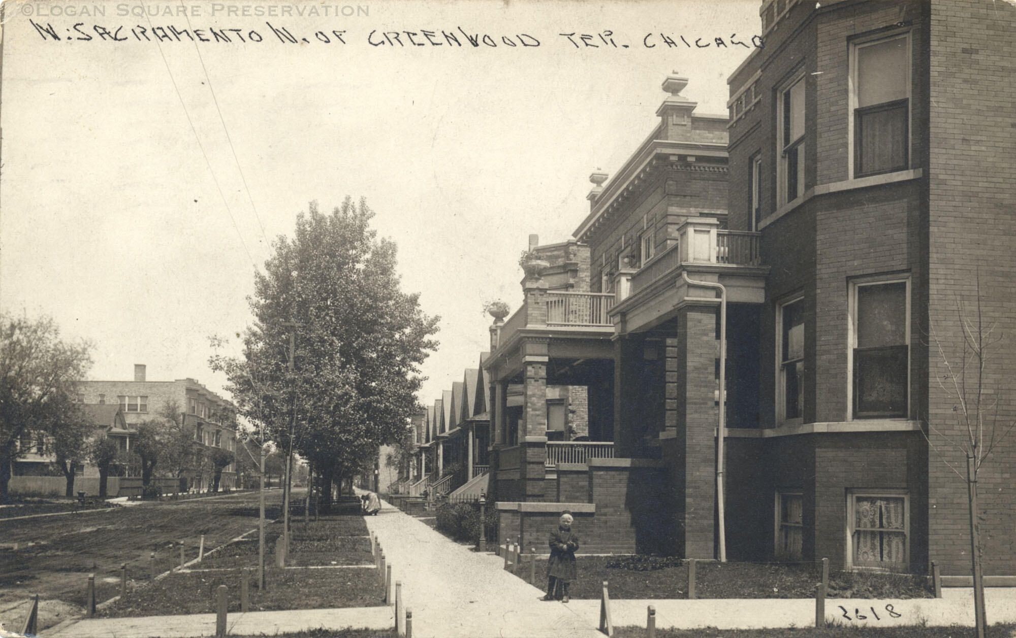 Real-photo postcard view of girl in front of brick two-flats and workers cottages on east side of 2501 block of N. Sacramento Ave. from corner of Altgeld St (formerly Greenwood Terrace), circa 1910-13Subject Place