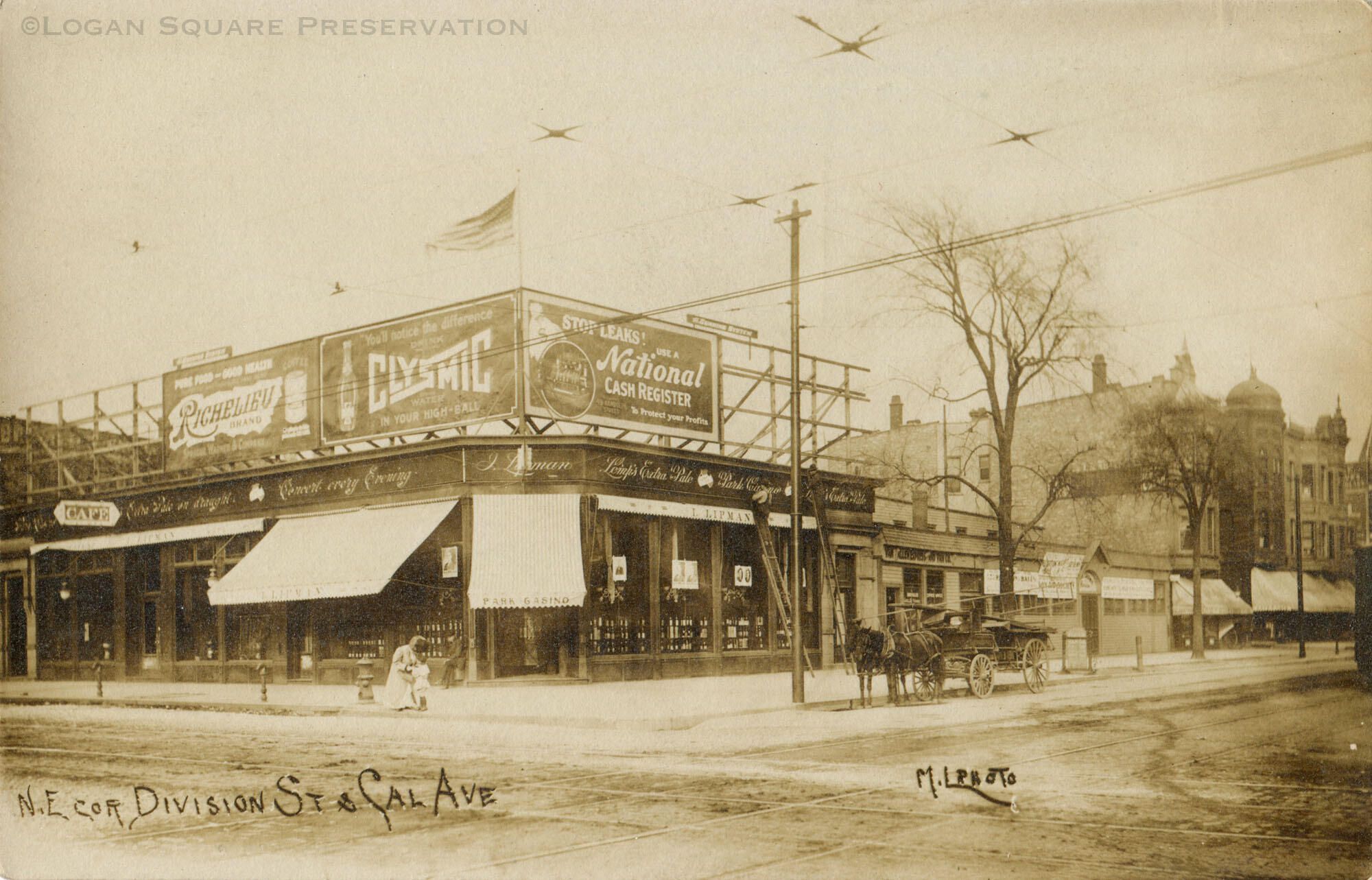 Real-photo postcard view of Park Casino at northeast corner of Division & California with billboard advertisements on roof and wagon parked in front, circa 1907-1908Subject Person/Organization