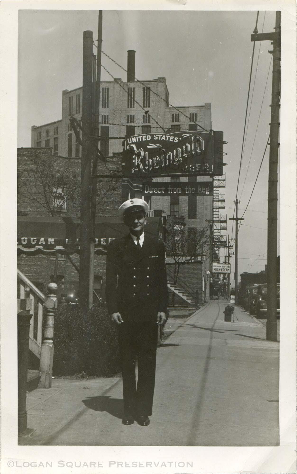 Snapshot photo of man in Navy dress uniform with Logan Garden awning and Rheingold beer sign behind. Back of Morris B. Sachs department store and sign for Edgebrook Dairy Store visible in distancePhotograph Details