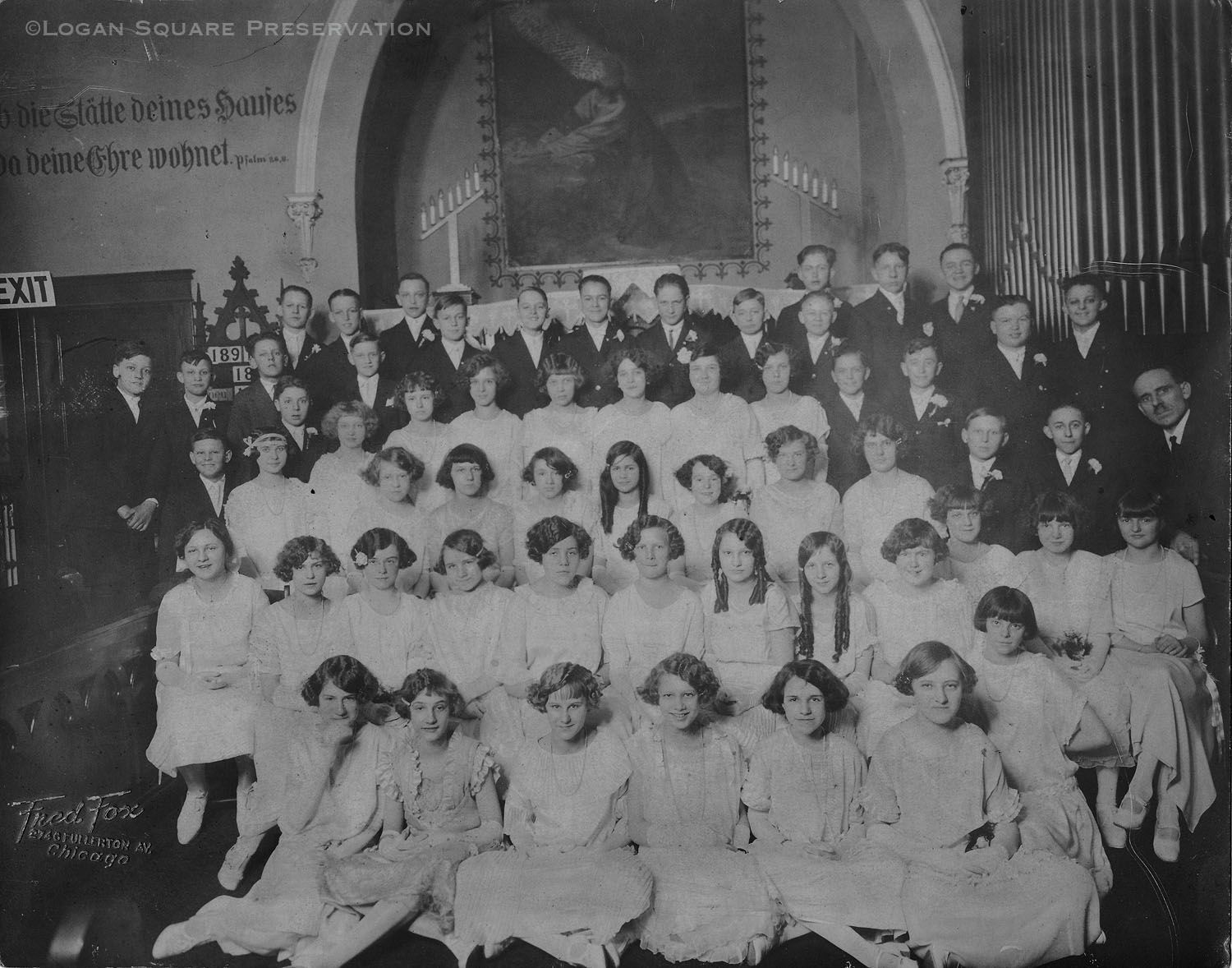 Portrait of large group of confirmands with pastor August Glade in sanctuary of Nazareth Evangelical Church, 1924Photograph Details