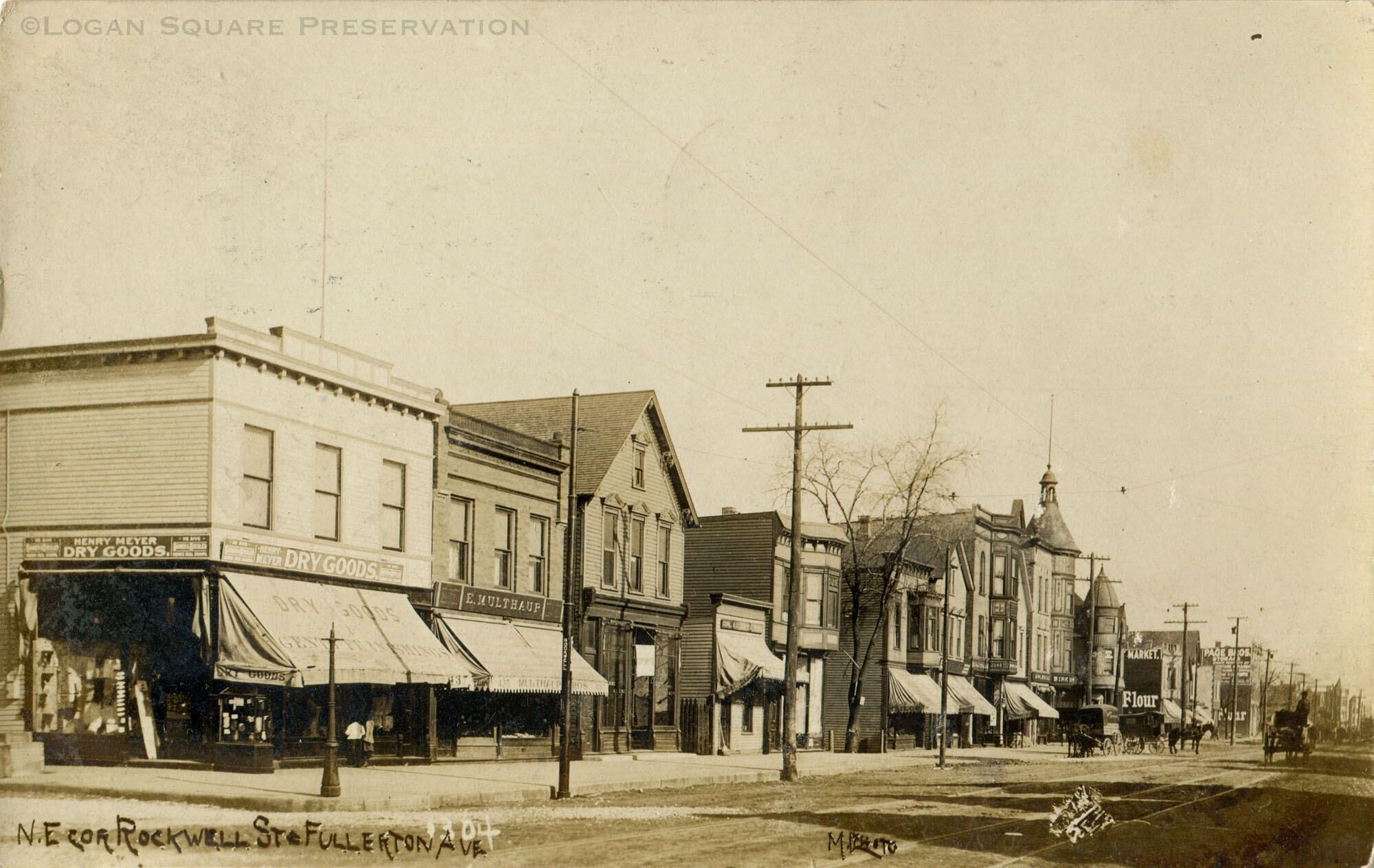 Real-photo postcard view of mixed-use storefronts and apartments on north side of 2500 block of Fullerton Ave east of Rockwell St, circa 1909