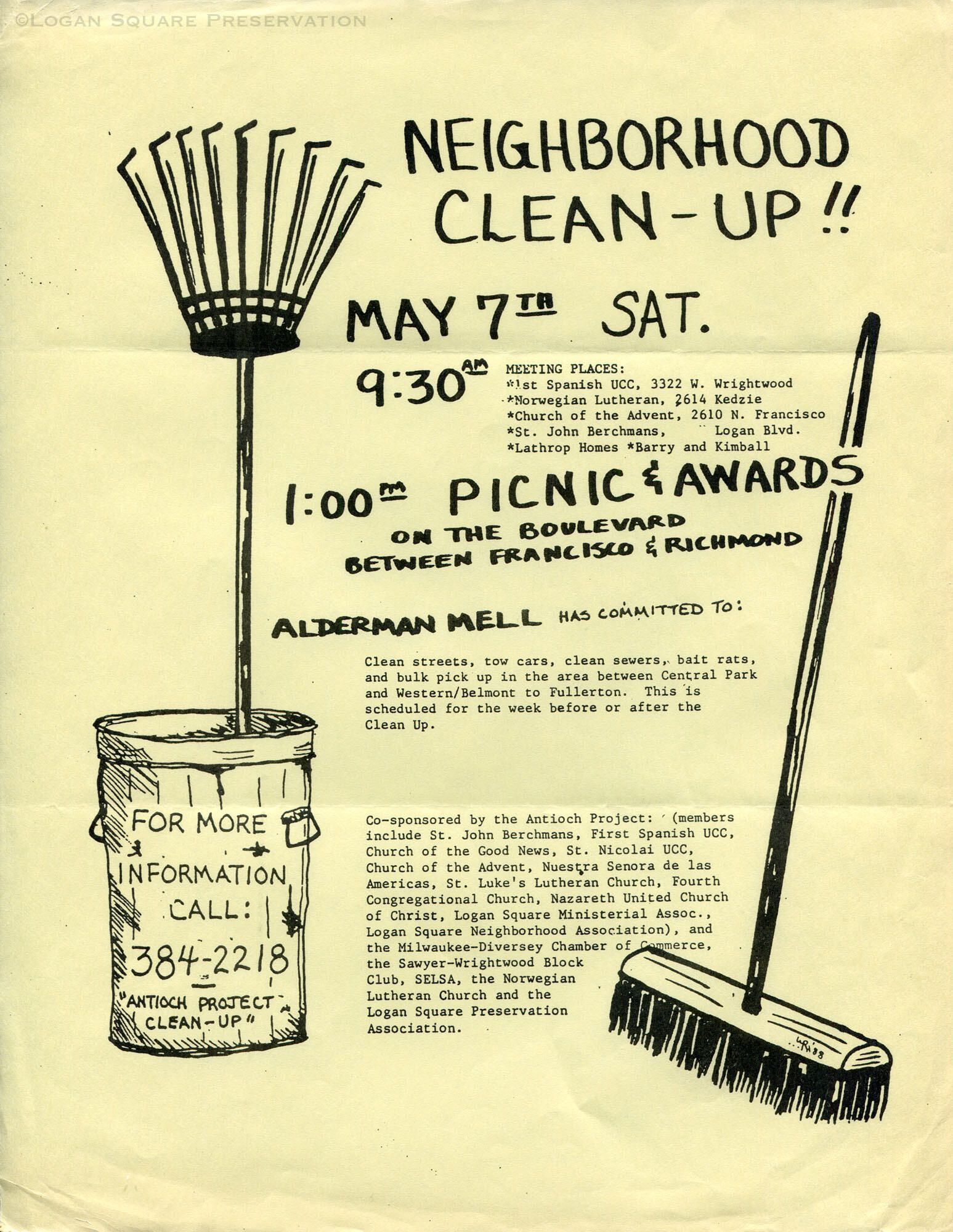 Photocopied flyer on yellow paper for neighborhood cleanup day May 7th, 1988, sponsored by the Antioch Project consortium of neighborhood groupsCollection