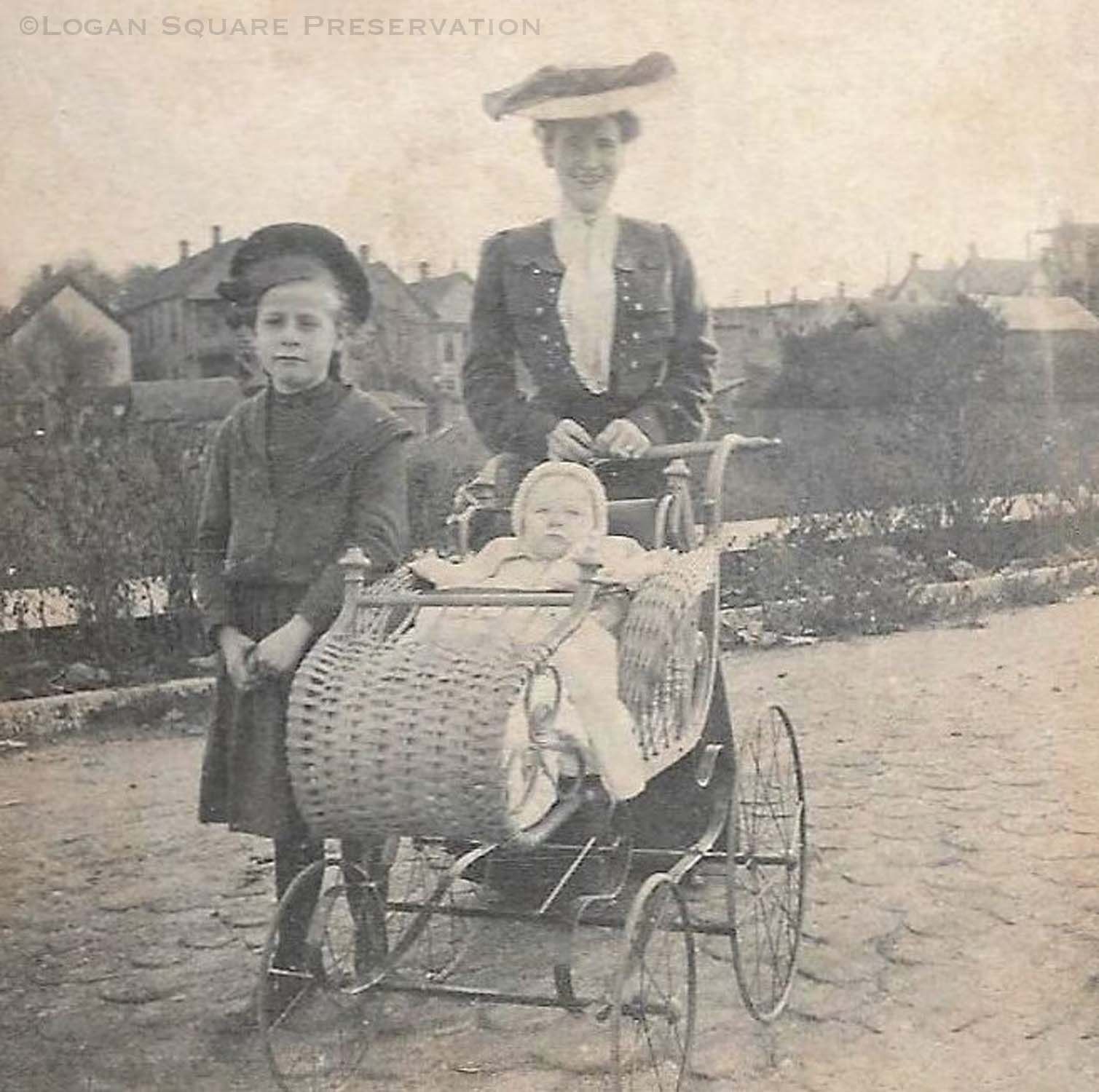 Snapshot photo of Minnie Wilson, Nellie Heinking and baby Irene Heinking in wicker stroller standing on wood-paved Medill Ave (formerly Berlin St) with empty lot behind and gable-roofed cottages and two-flats in distance, circa 1902Photograph Details