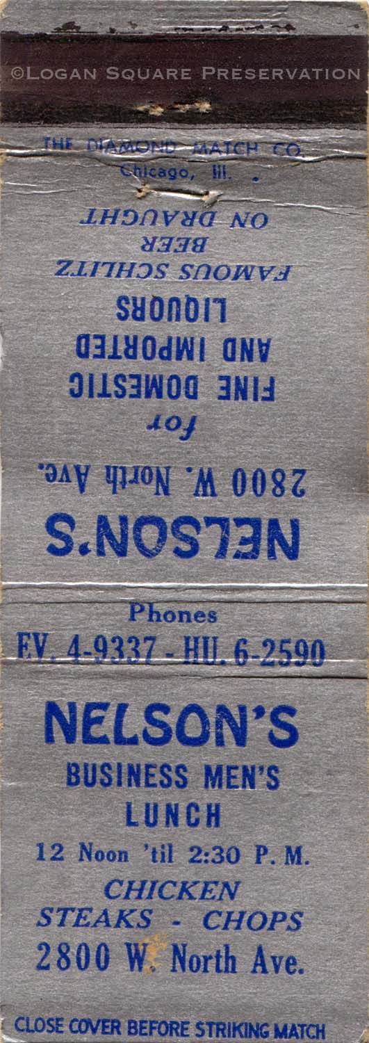 1.5" matchbook printed in blue ink on silver paper for Nelson's tavern, circa 1940sPublication Details