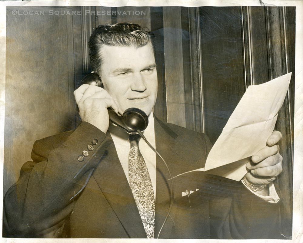 News photo portrait of newly-elected 35th Ward alderman Casimir "Casey" Laskowski on telephone with paper in hand, 1955Photograph Details