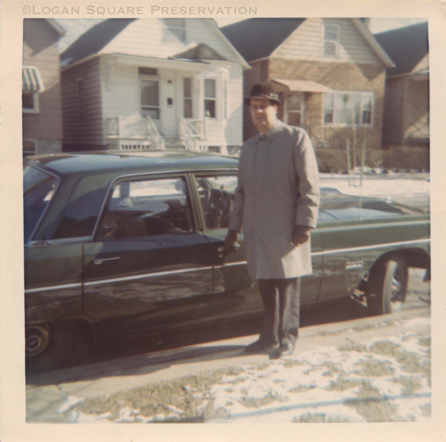 Snapshot photo of Donald Fye standing next to new Plymouth Fury sedan with cottages on Richmond St in background, February 11, 1968Photograph Details