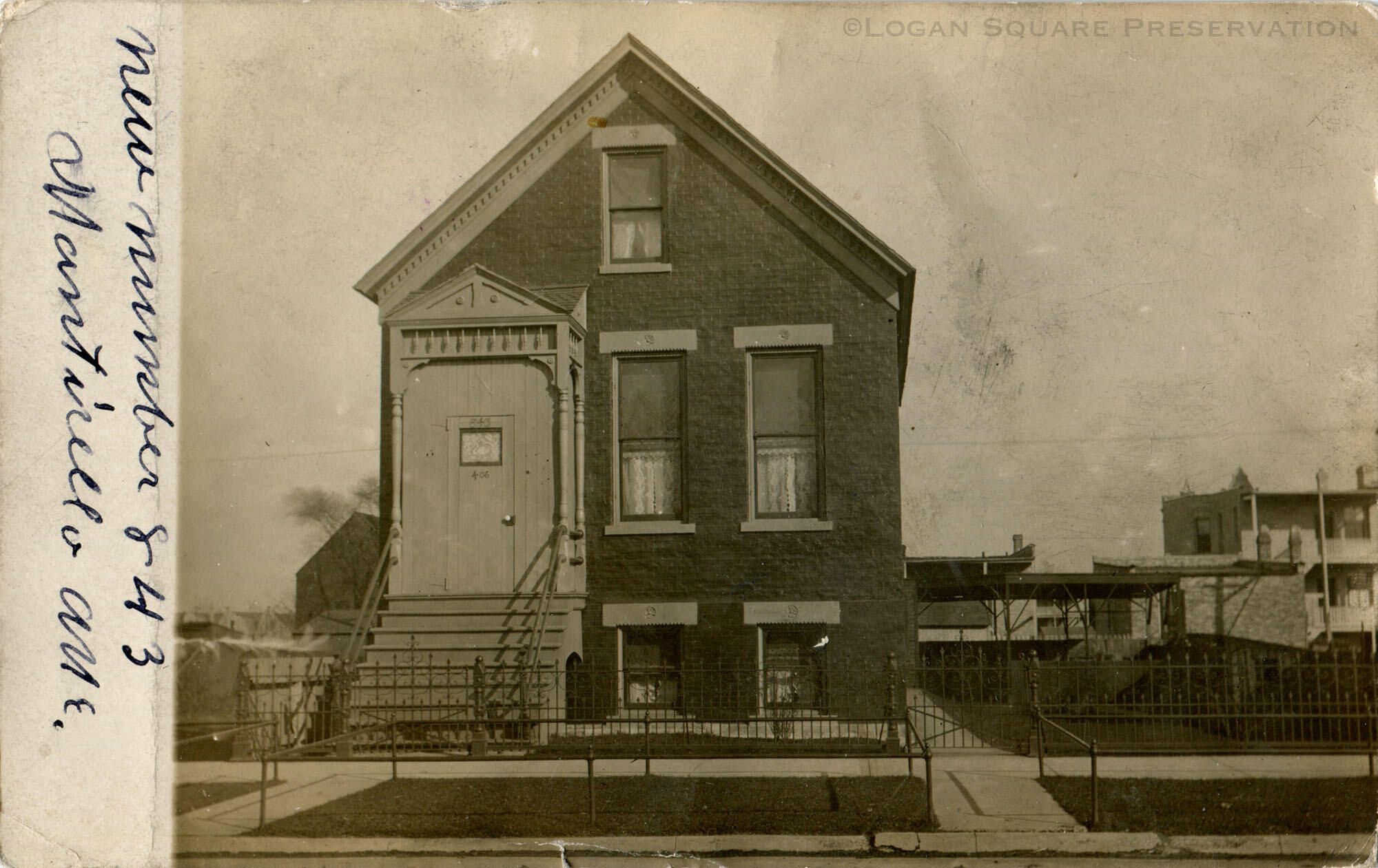 Real-photo postcard view of brick workers cottage with new and old address numbers on front door during Chicago address renumbering 1909Subject
