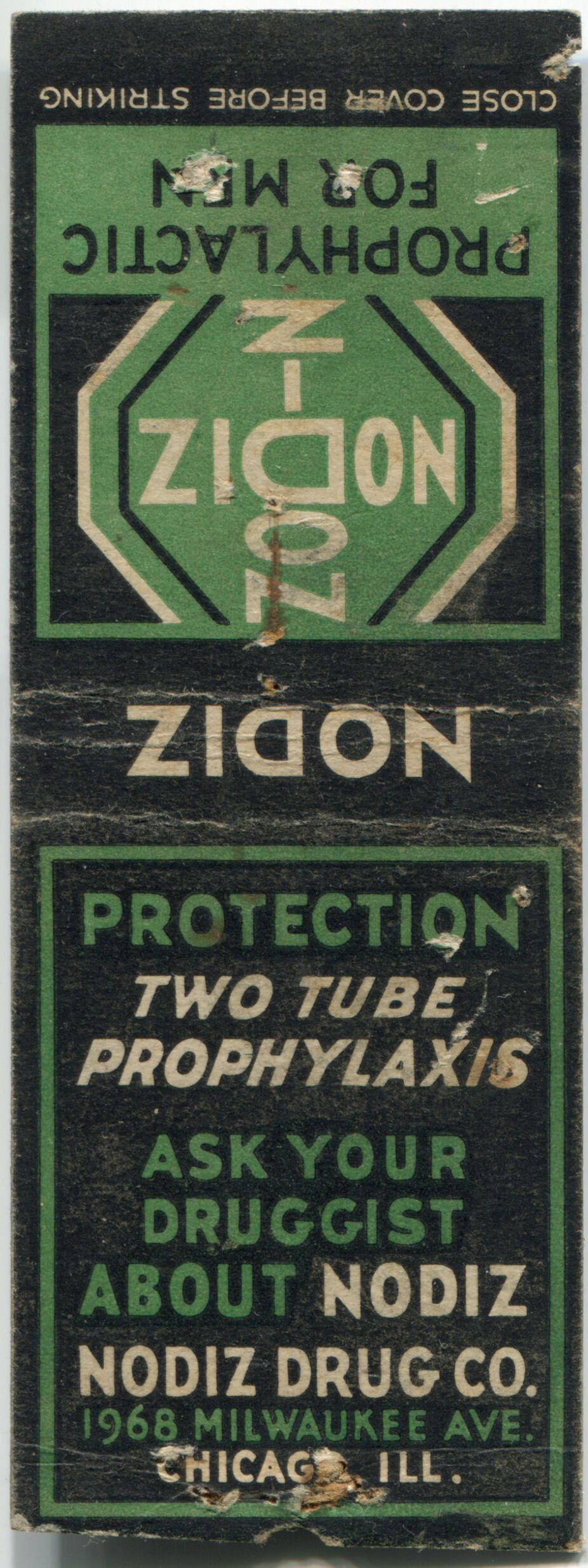 1.5" black & green matchbook cover for Nodiz Drug Co., circa 1936Publication Details