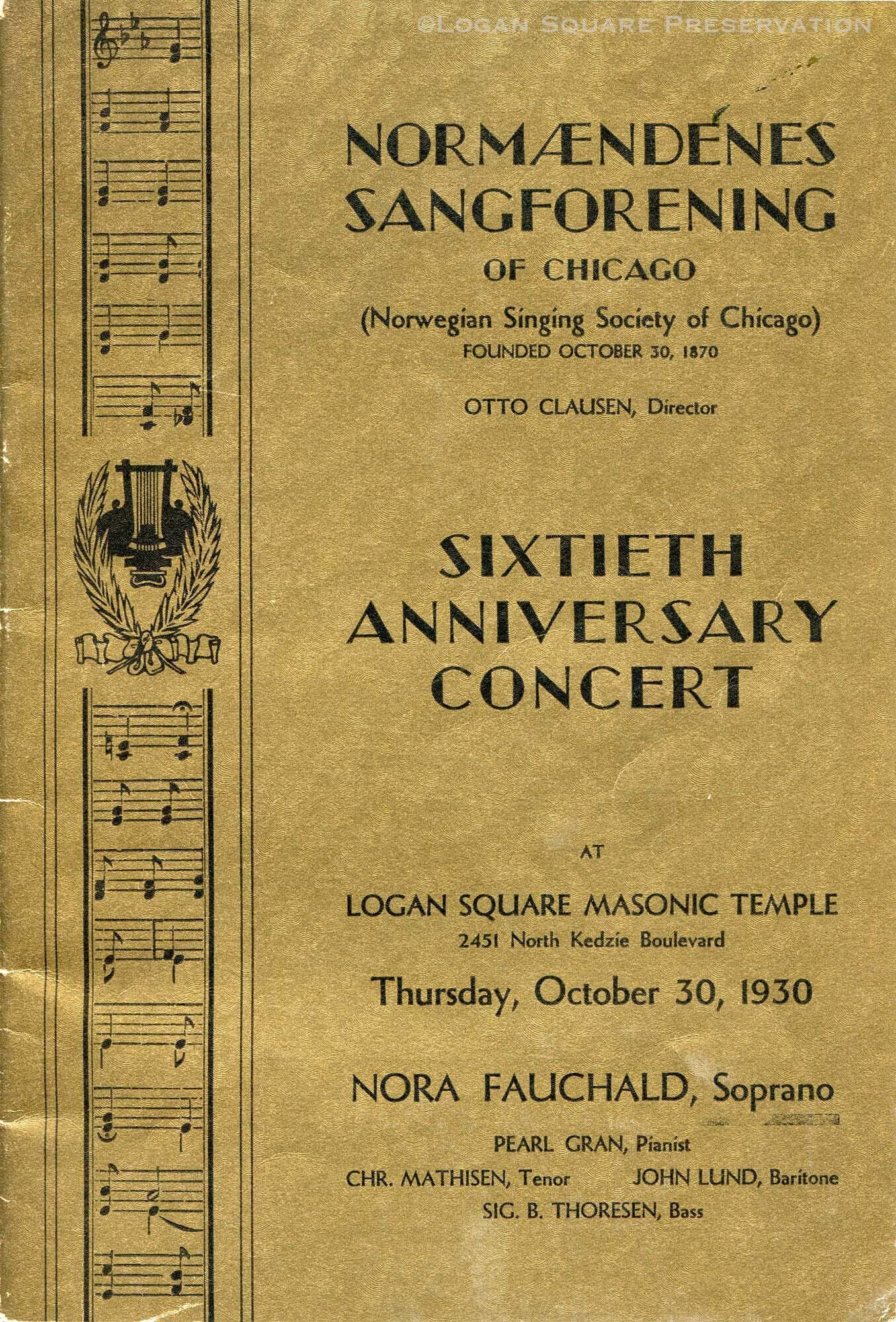50-pg souvenir program with gold cover from Norwegian-language choral concert for 60th anniversary of Normaendenes Sangforening chorus at Logan Square Masonic Temple, Oct 30, 1930. Includes neighborhood business adsPublication Details
