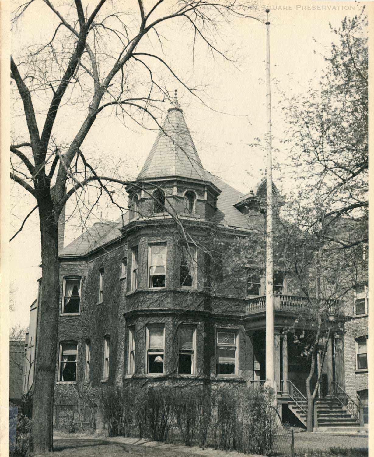 Enlarged reprint photo of ivy-covered Normennenes Club House with 52-foot flagpole made from wood from three Norwegian ships and Admiral Byrd's polar ship, marked on back as printed Jul 8, 1936Photograph Details