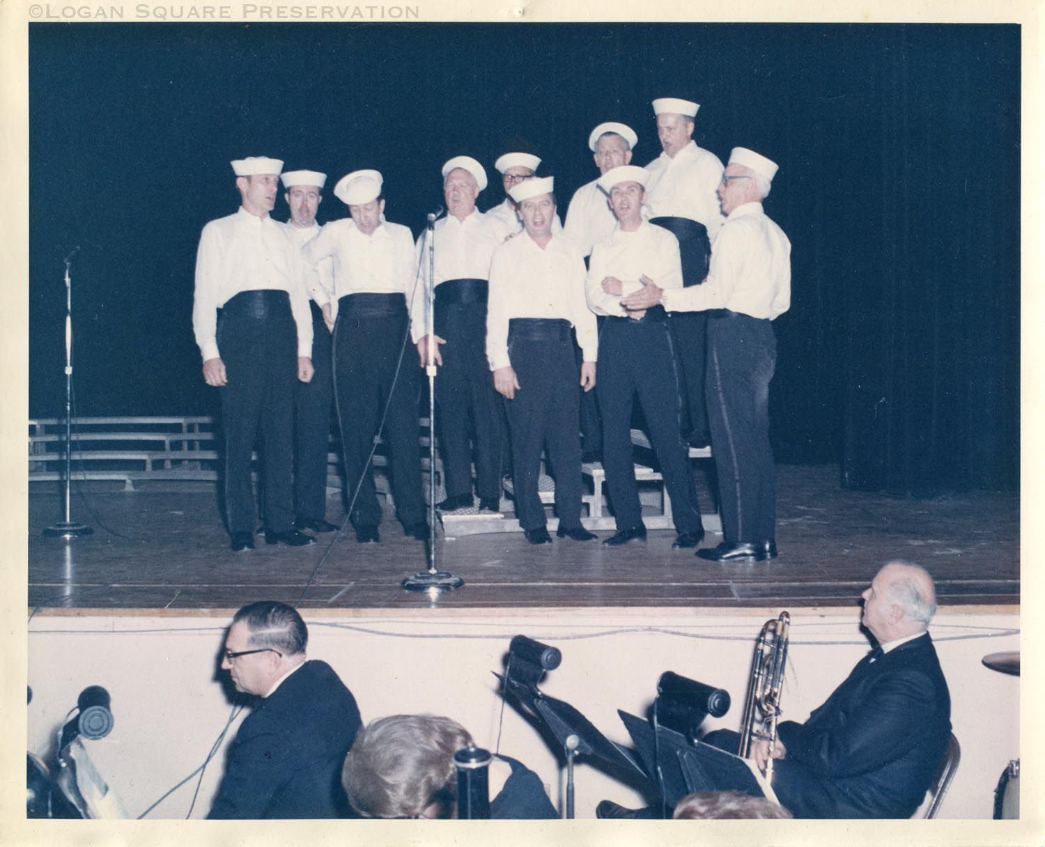Photo of ten members of Normennenes Choir in sailor caps singing in concert on stage, circa 1960s. Accompanying note identifies some choir members in photo as: Earl Bruhn, John Iverson, Rex Sande, Kermit Tangeros, Kai Henriksen, Bill Halthen, Bob Riis, Dale HoidahlPhotograph Details