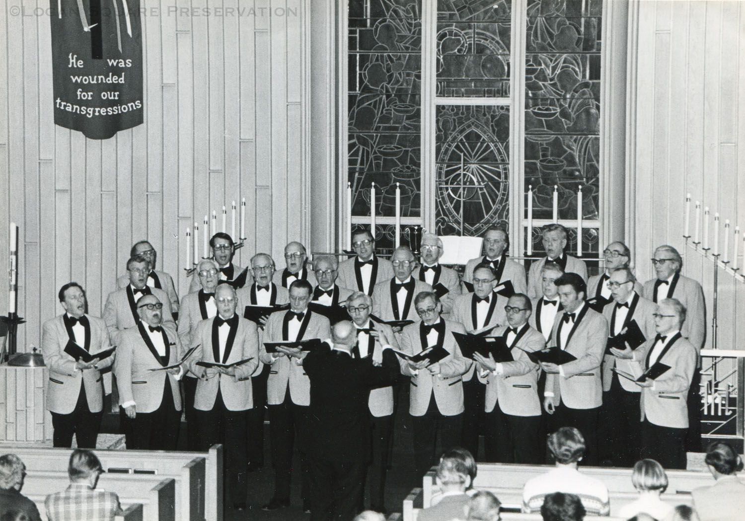 Photograph of mens choir in matching jackets singing in sanctuary of Edison Park Lutheran Church, March 1980Photograph Details