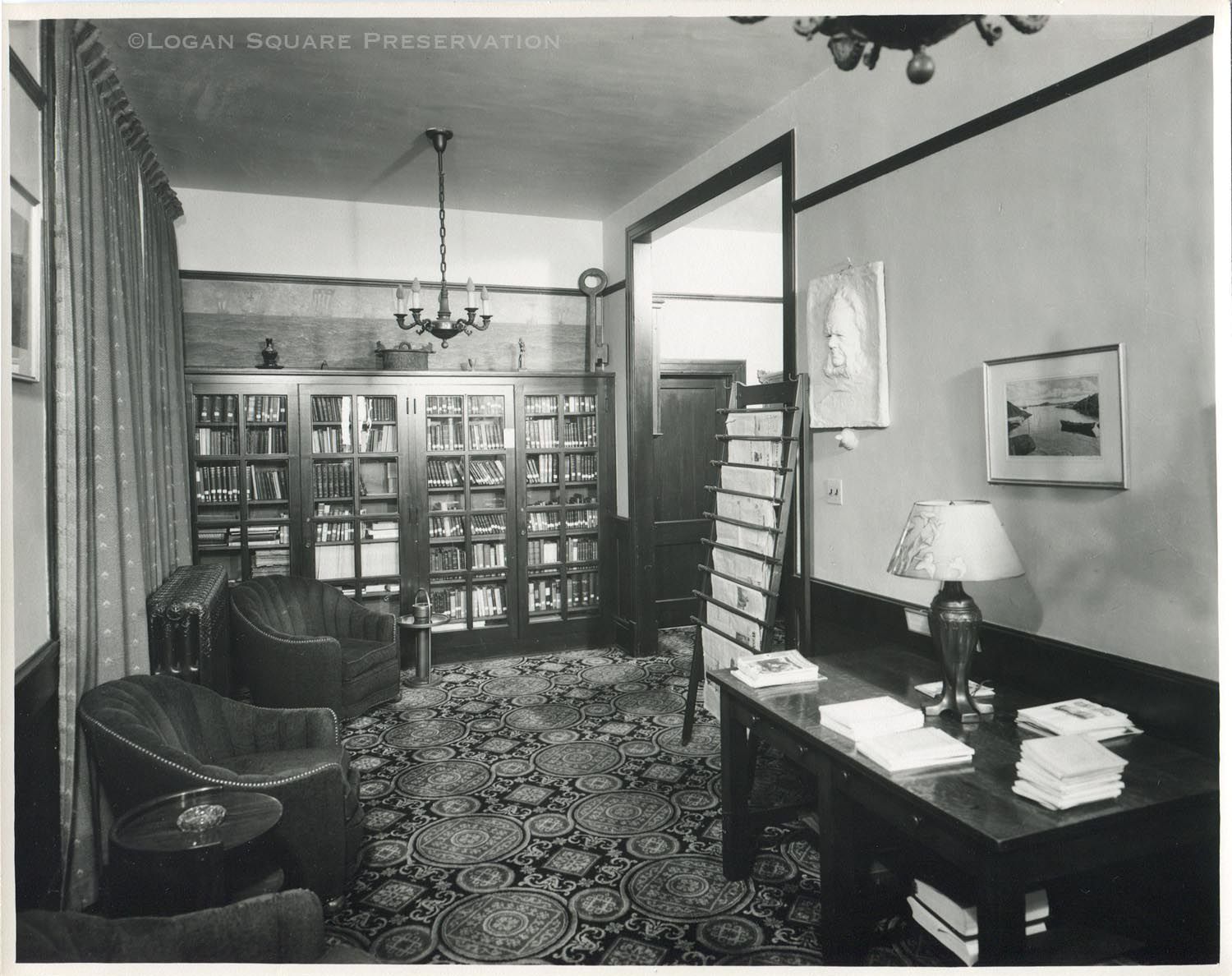 Photo of library room at Norske Klub with newspaper reading rack, glass-fronted bookshelves and armchairs. Large wooden key on top of bookshelf, with mural of Viking ships painted by artist Emil Biorn behind, circa 1940s,Photograph Details