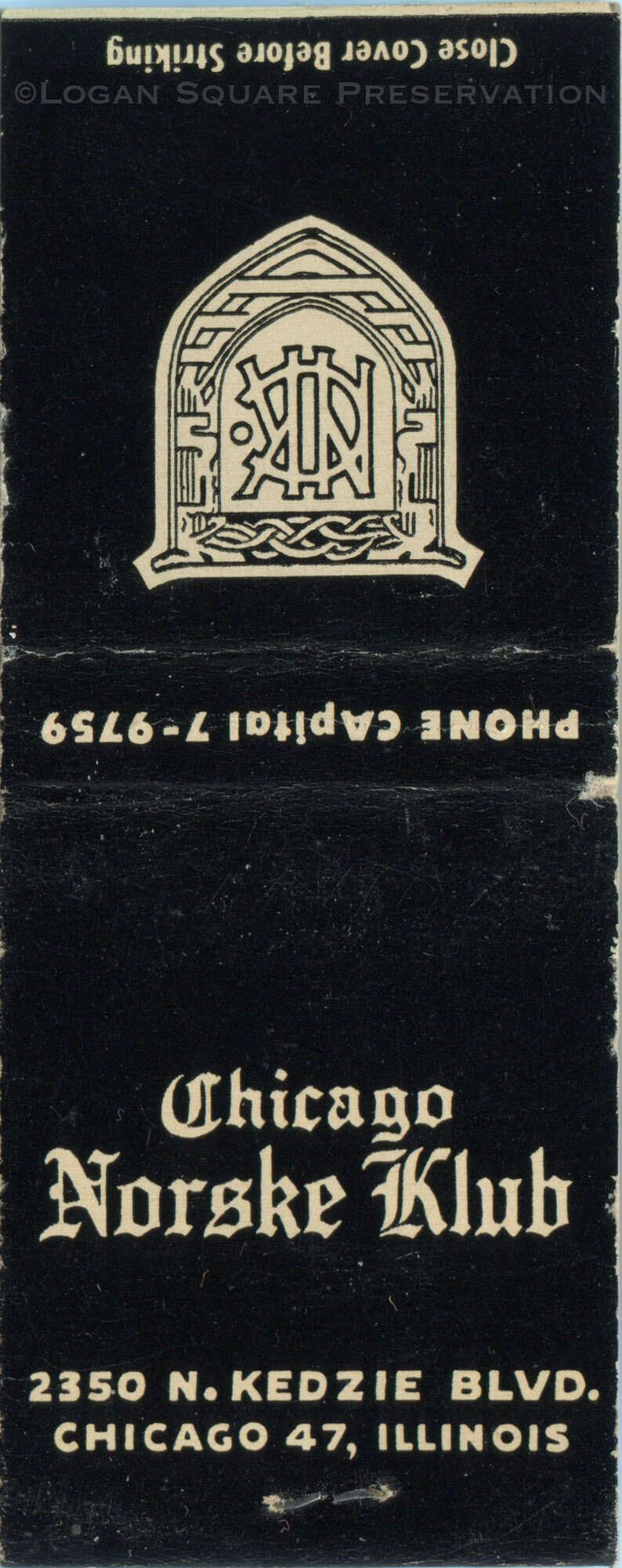 1.5" black matchbook cover with Norske Klub crest on back, circa 1940s-50sPublication Details