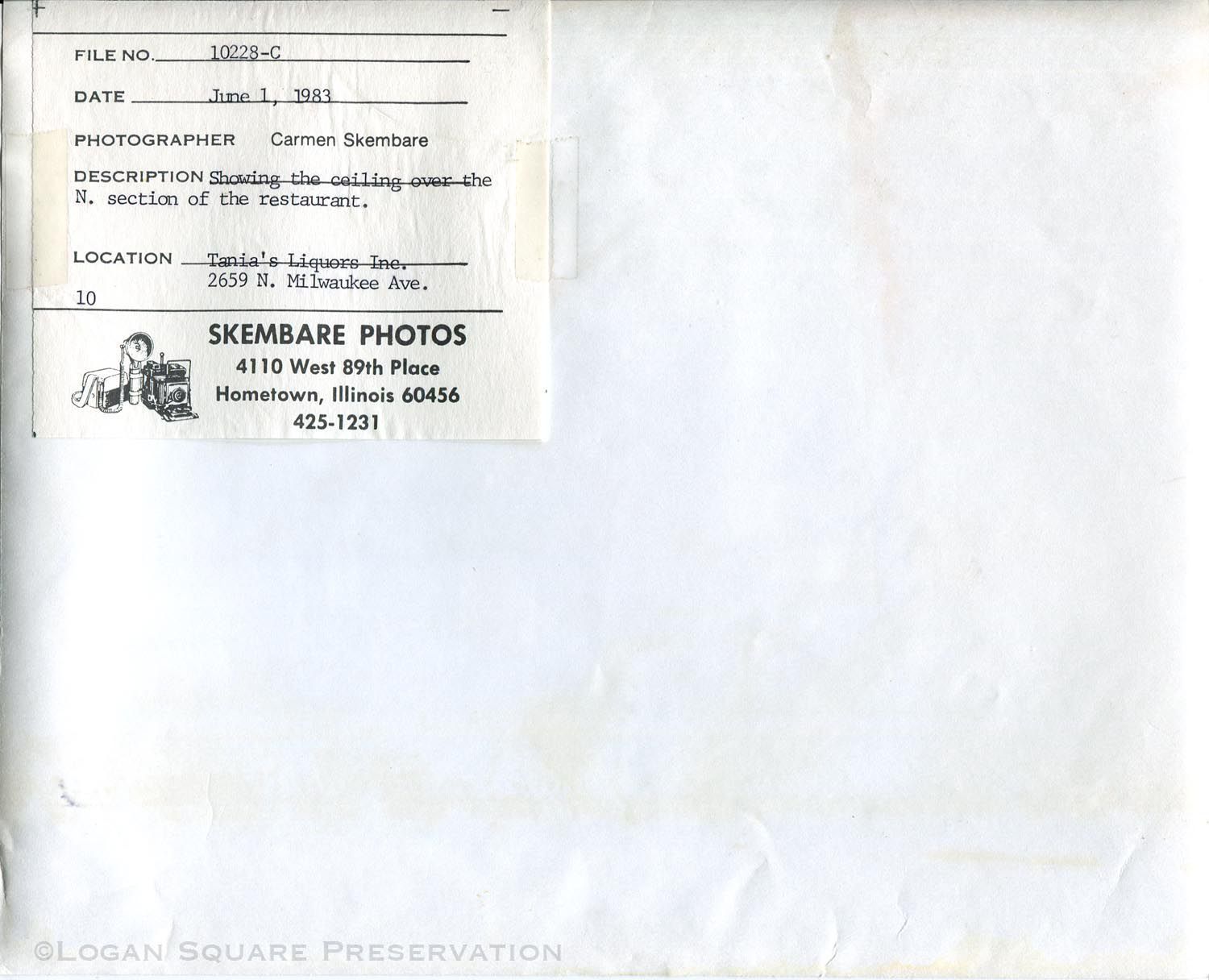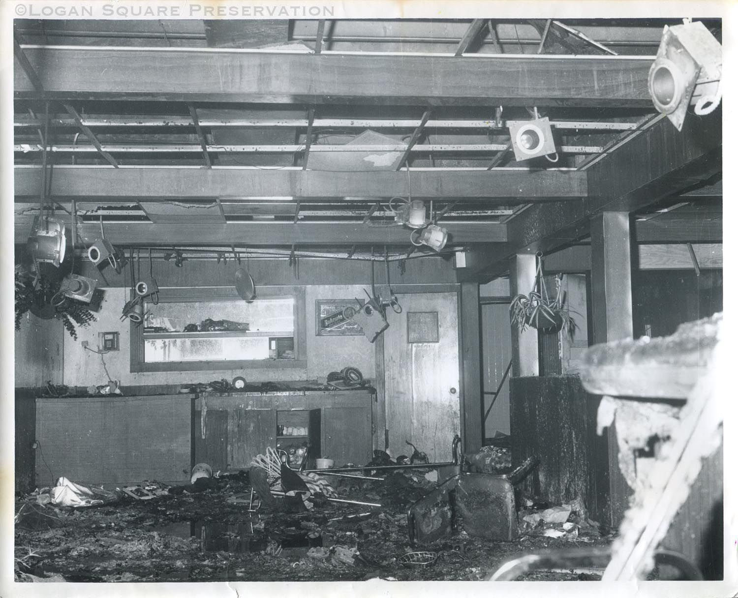 Documentation photo of fire-damaged ceiling over north (rear) section of Tania's restaurant, 1983Photograph Details