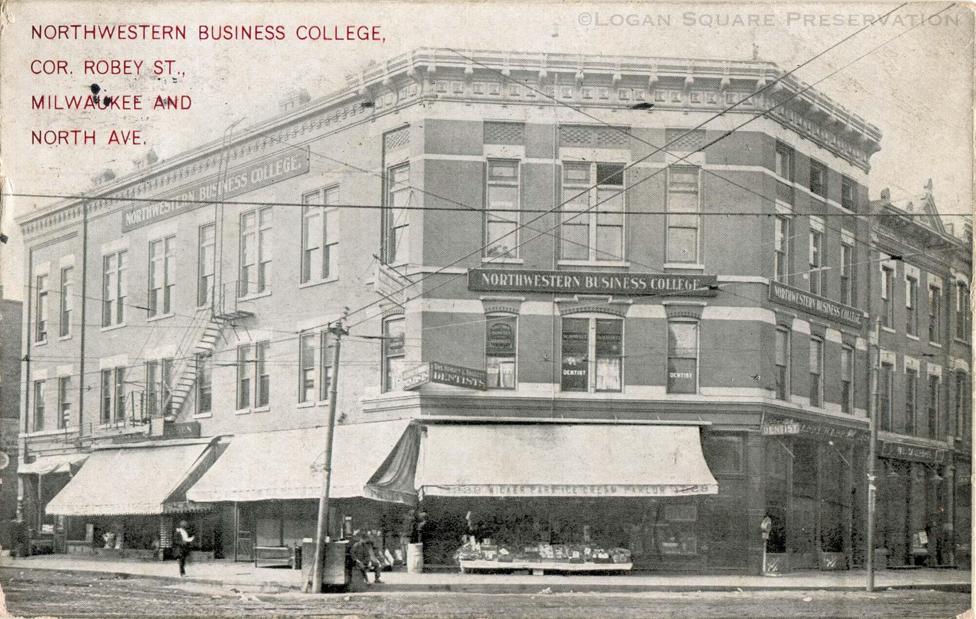 Halftone postcard view of 3-story brick Northwestern Business College at southwest corner of North & Damen, circa 1909Subject Person/Organization
