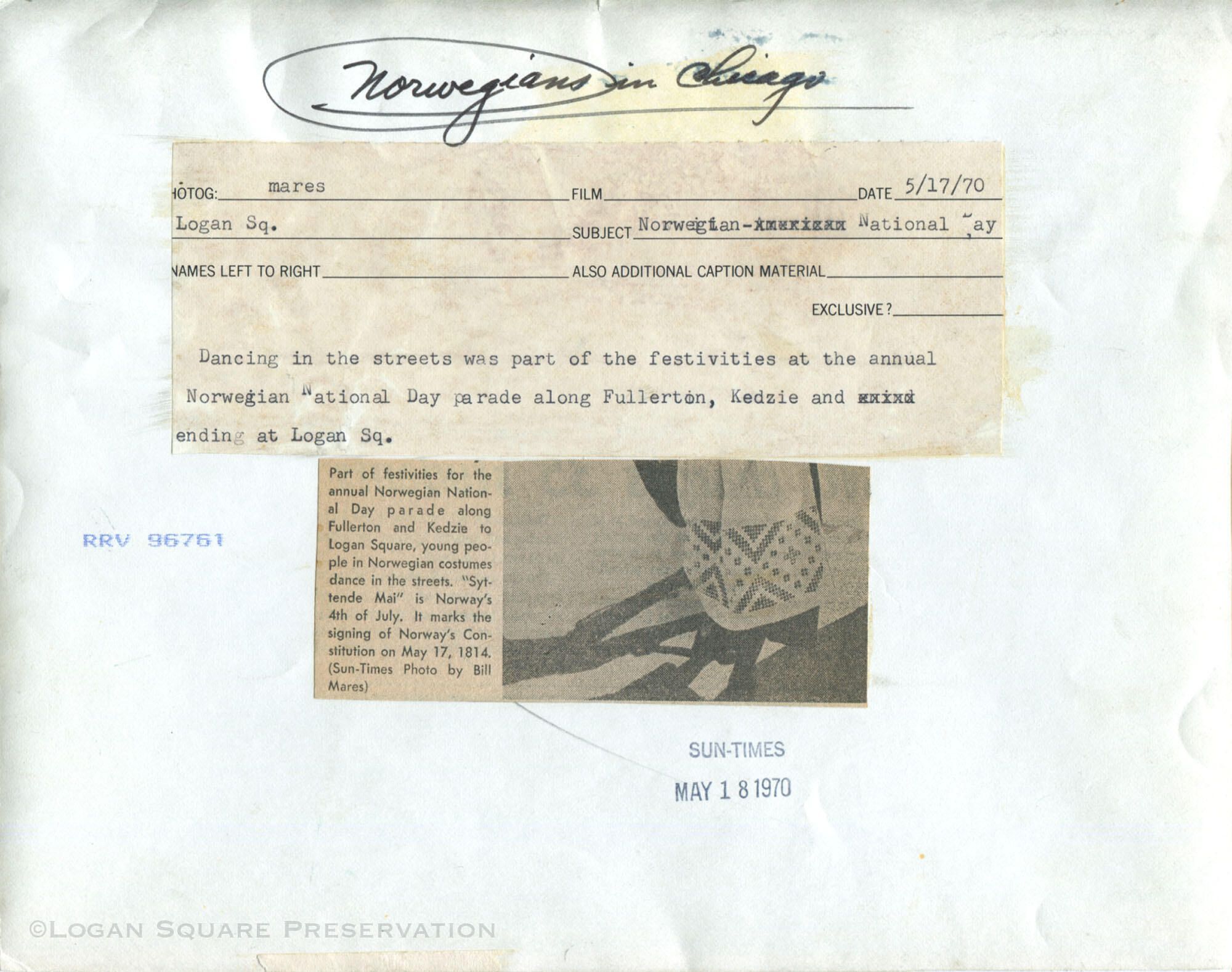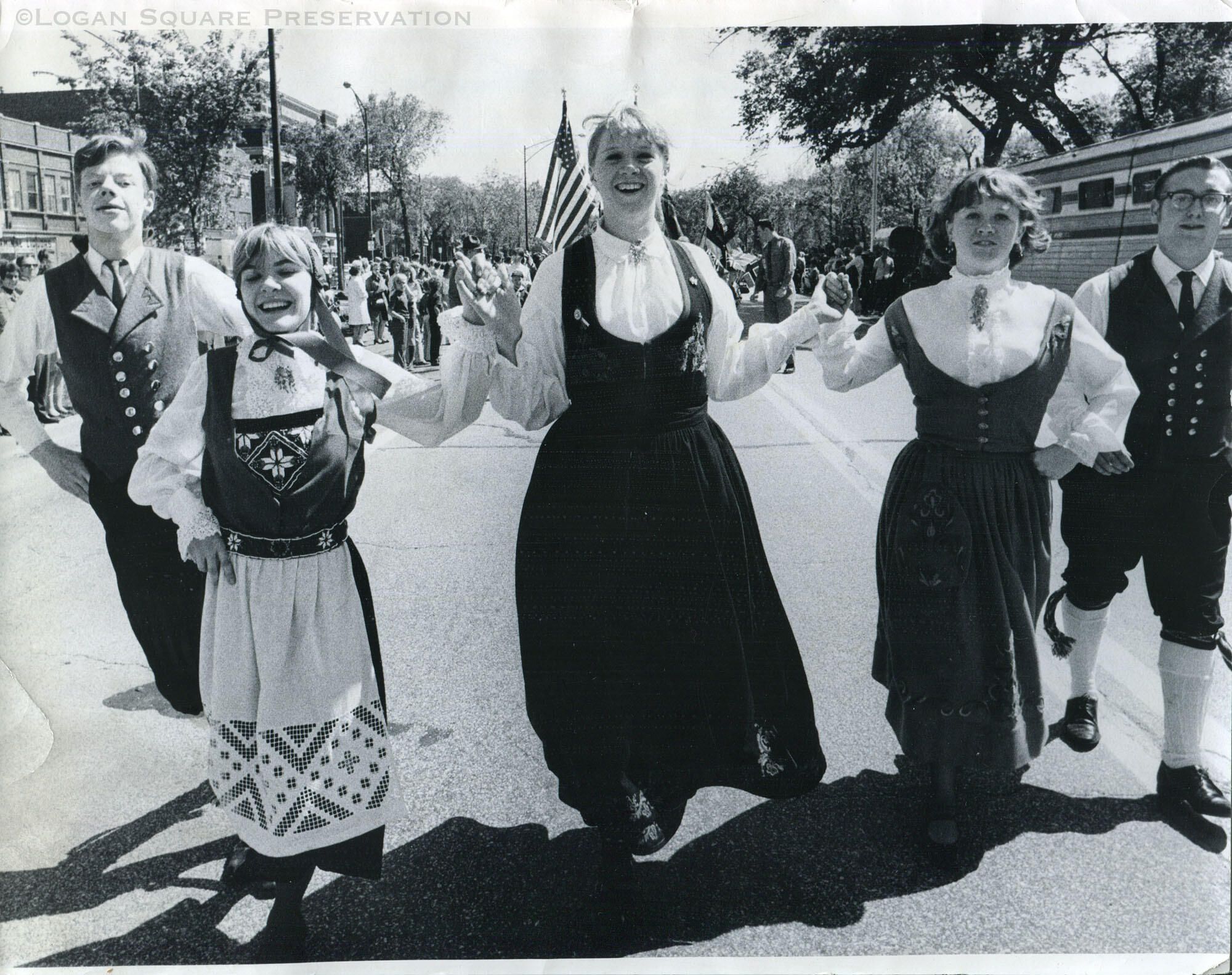 News photo view of dancers in Norwegian folk costumes facing north on Kedzie Blvd near Centennial Monument, May 17, 1970. Logan Square Masonic Temple in background left.Photograph Details