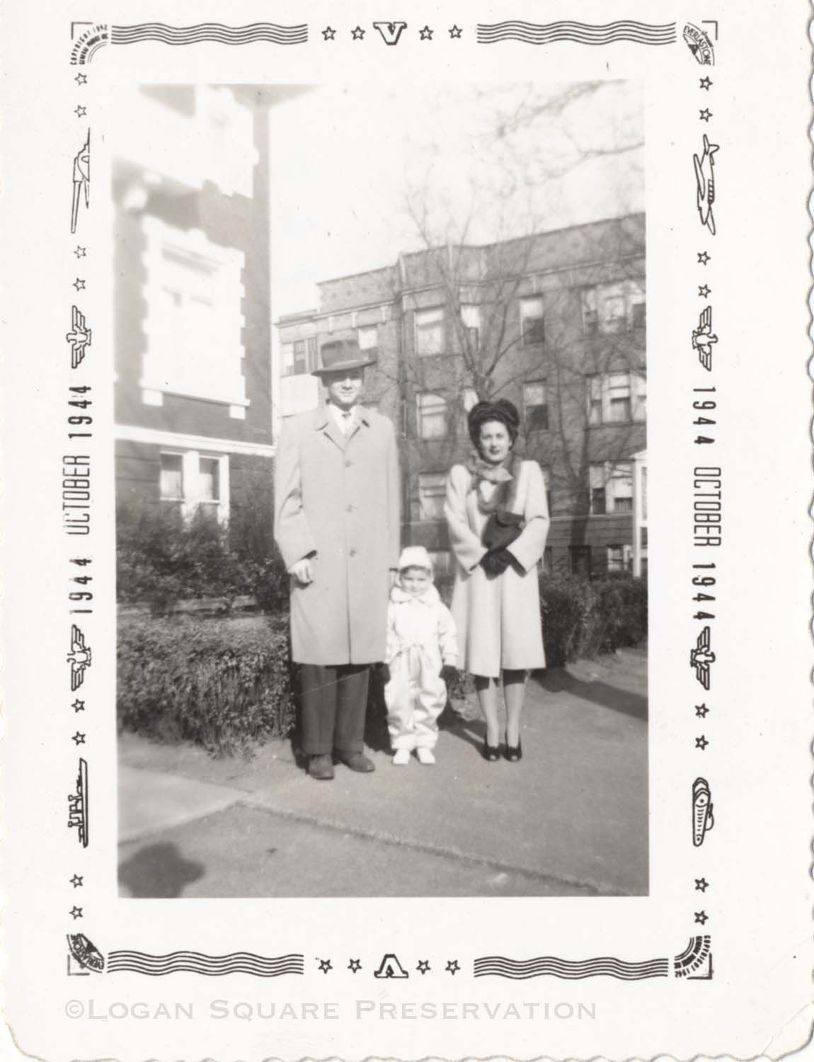 Snapshot photo of Vaselios & Angeline Vaselopulos with son George standing in front of 3000 W. Logan Blvd. Printed Oct 1944 but possibly taken in spring 1944Photograph Details