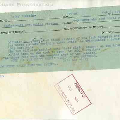 News photo of Shakespeare 14th District police officers Dan Noon and Roman Keating (apparently cropped out of enlarged photo) sitting at table with pistols and shells fired at officers during fatal gun battle with three "Hard Hat" robbers along with bag of money stolen in stick-up of Alex's Tavern at 1645 W. Cortland AvePhotograph Details