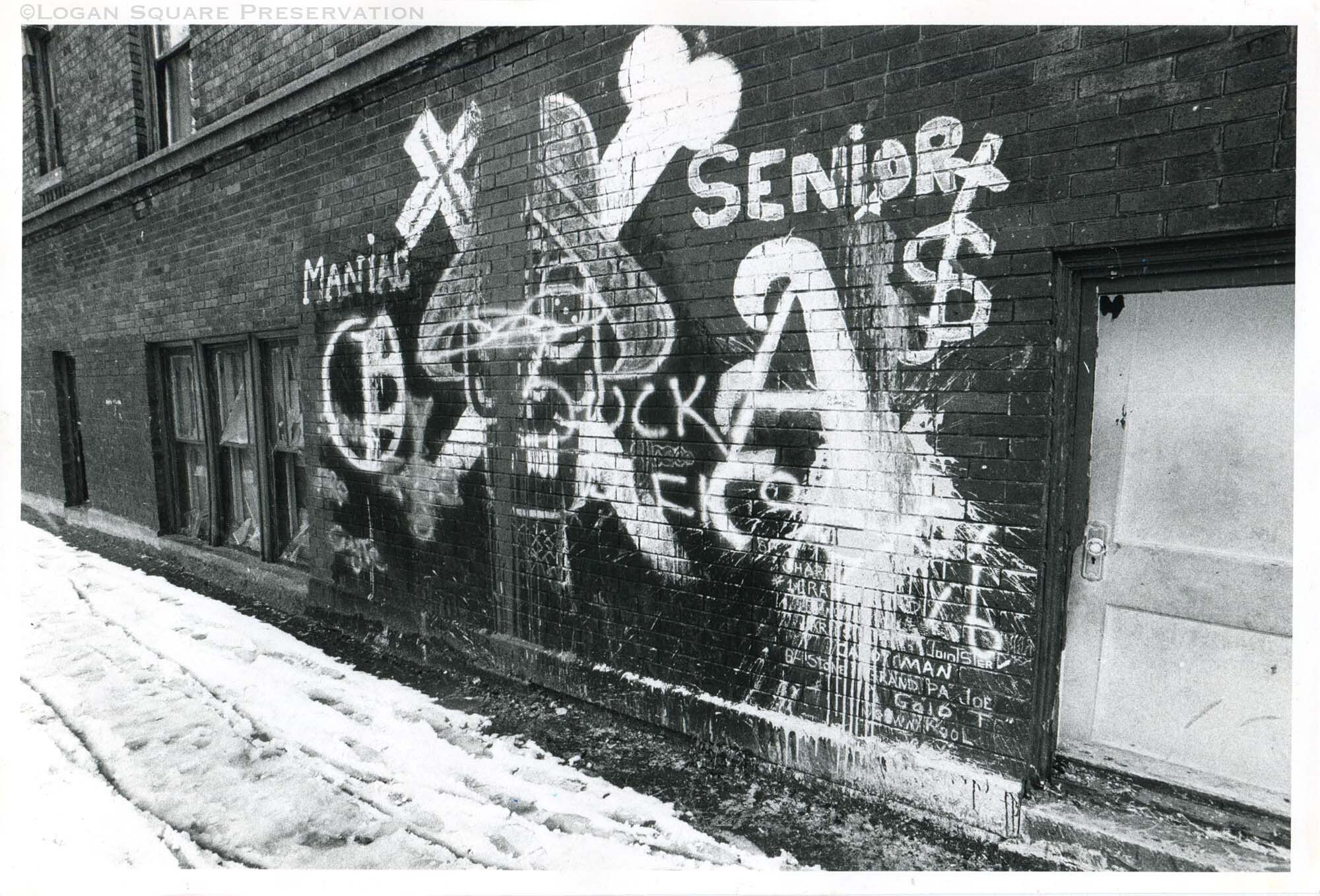 News photo of defaced Maniac Senior Orquestra Albany pirate face gang graffiti with listing of gang members underneath on southeast wall of apartment building near snowy sidewalk, 1978Photograph Details