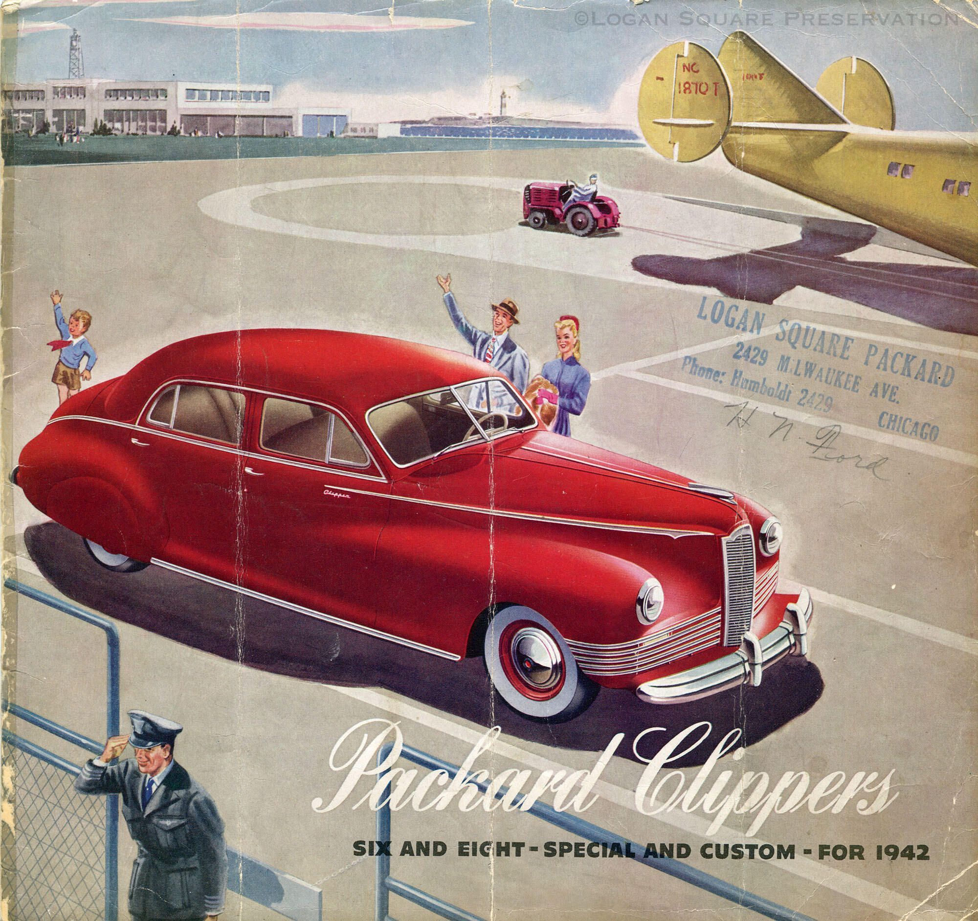 16-pg color brochure illustrating Packard automobiles available in 1942, ink stamp from Logan Square Packard on coverPublication Details