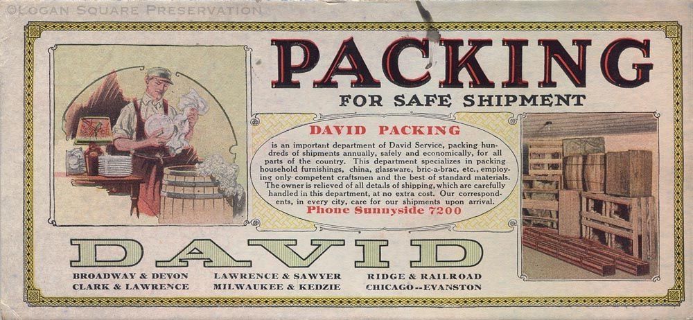 Ink blotter advertisement for packing services at David storage warehouses with illustrations of man packing dishes in barrel and stacked crates and barrels, circa 1920sPublication Details