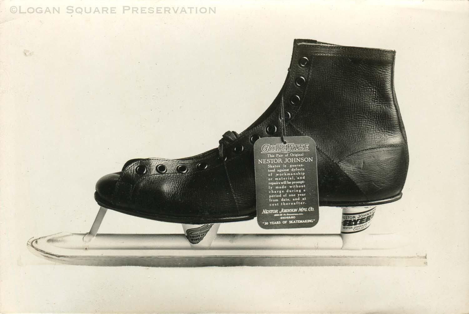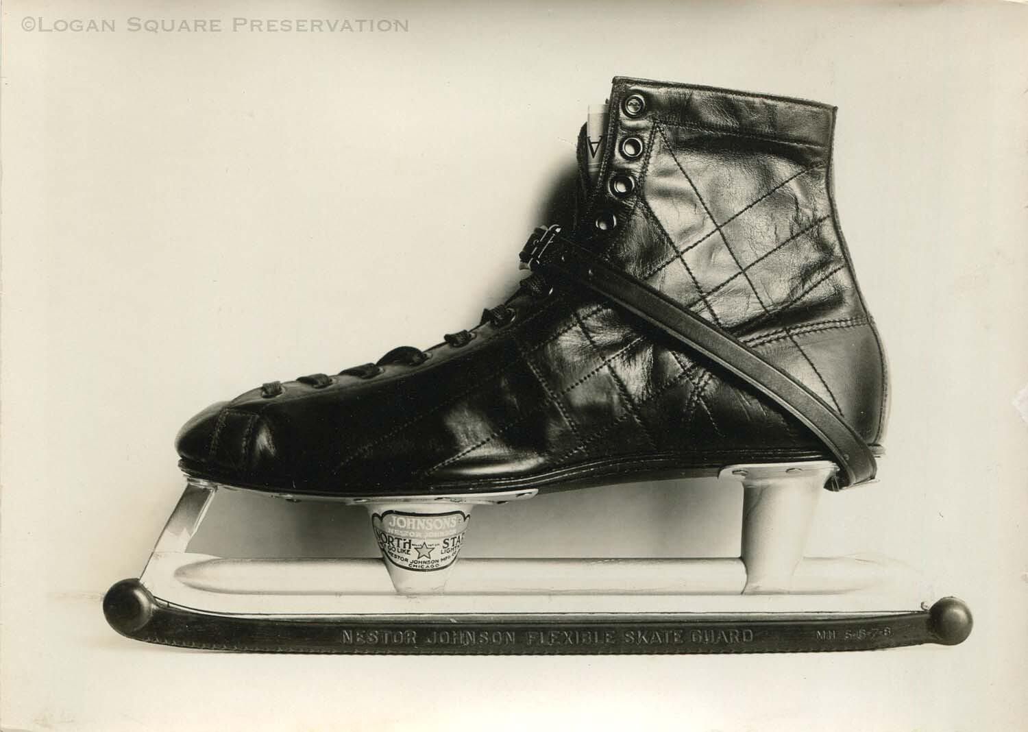 Product photos of black leather Nestor Johnson ice skates on white background, circa 1936Photograph Details
