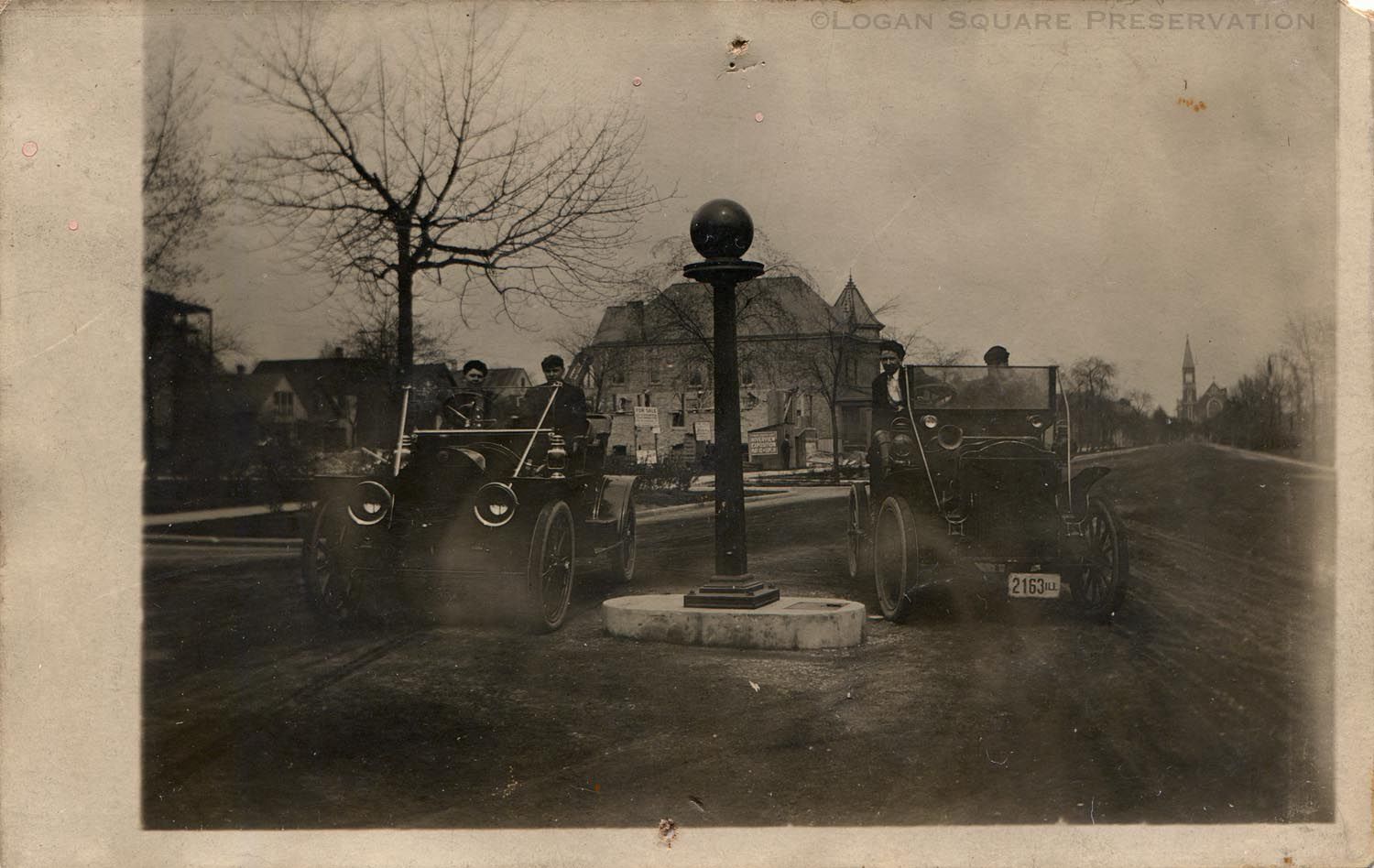 Real-photo postcard view of two automobiles stopped near lamp post at northwest corner of Palmer Square. Bricklayers are building walls of house at 3120 W. Palmer behind the lamp post, with real estate for sale signs posted on empty lot at 3128 W. Palmer and advertisement for Riverview Exposition. Back of cottages and 2-flats along Lyndale St visible on left, St. Sylvester church visible at the far east end of Palmer Square on right. April 1909Subject Place