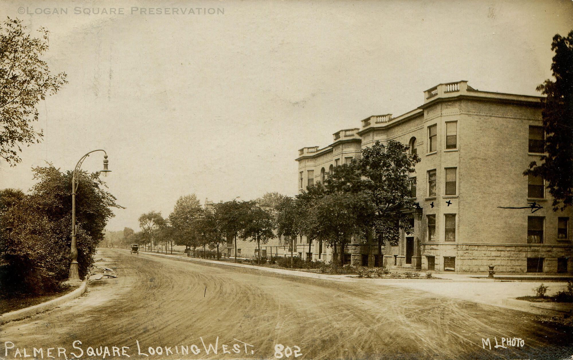 Real-photo postcard view looking west at Palmer View Apartments on north side of Palmer Square, circa 1907-1908. Second floor apartment at 3000 W. Palmer Sq marked with "X"Subject