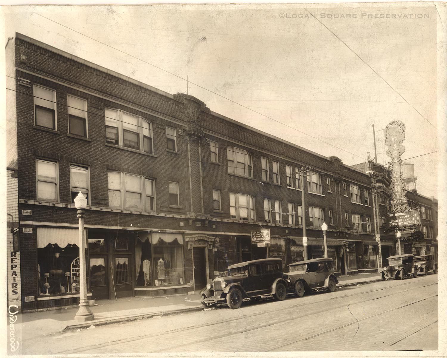 Logan Square Electric Shoe Repairing, Paramount Confectionery, Morris Lieblich, Osteopath, Victory Hat Cleaning and Shoe Repair, Paramount Theater (renamed Logan Theater 1929)