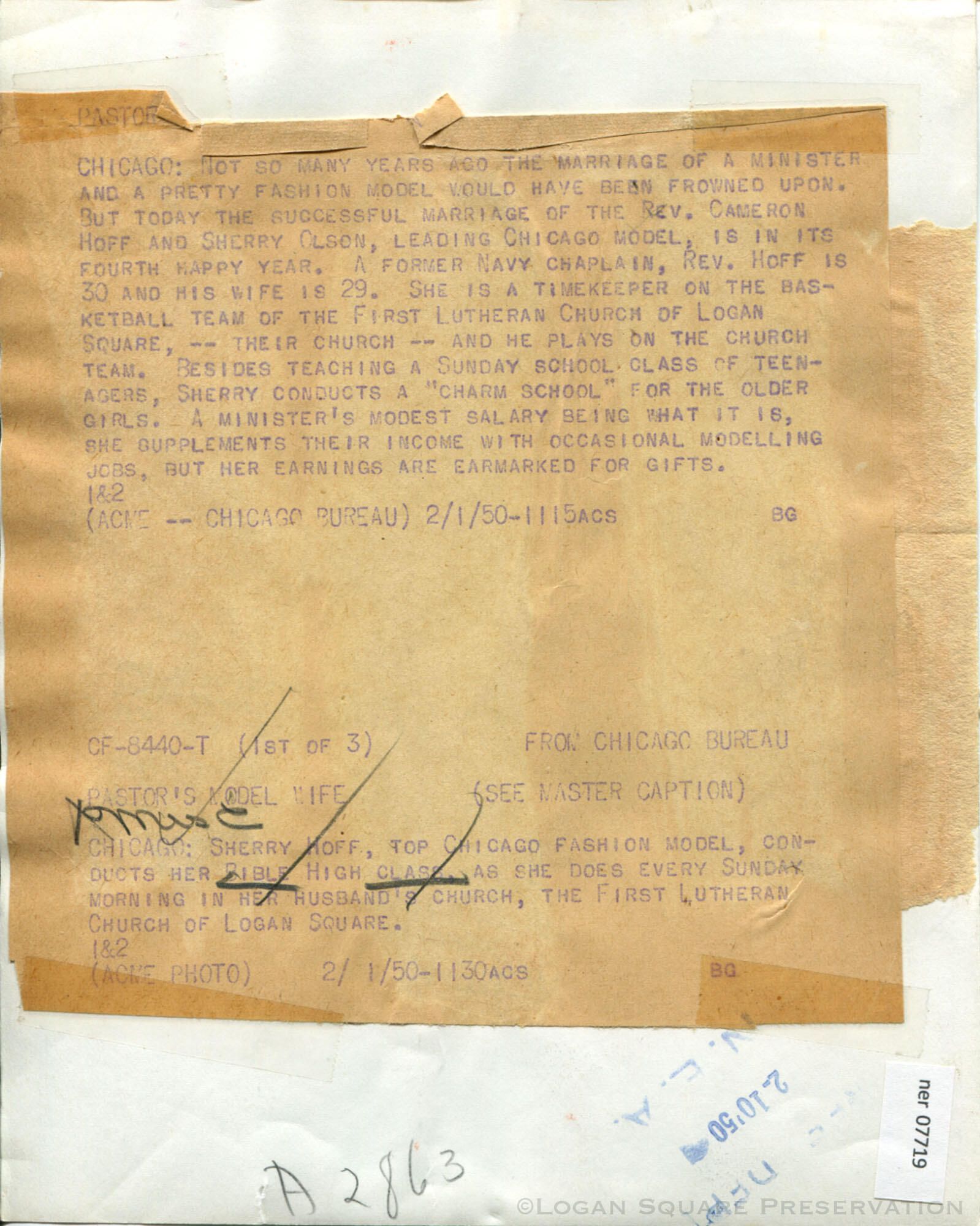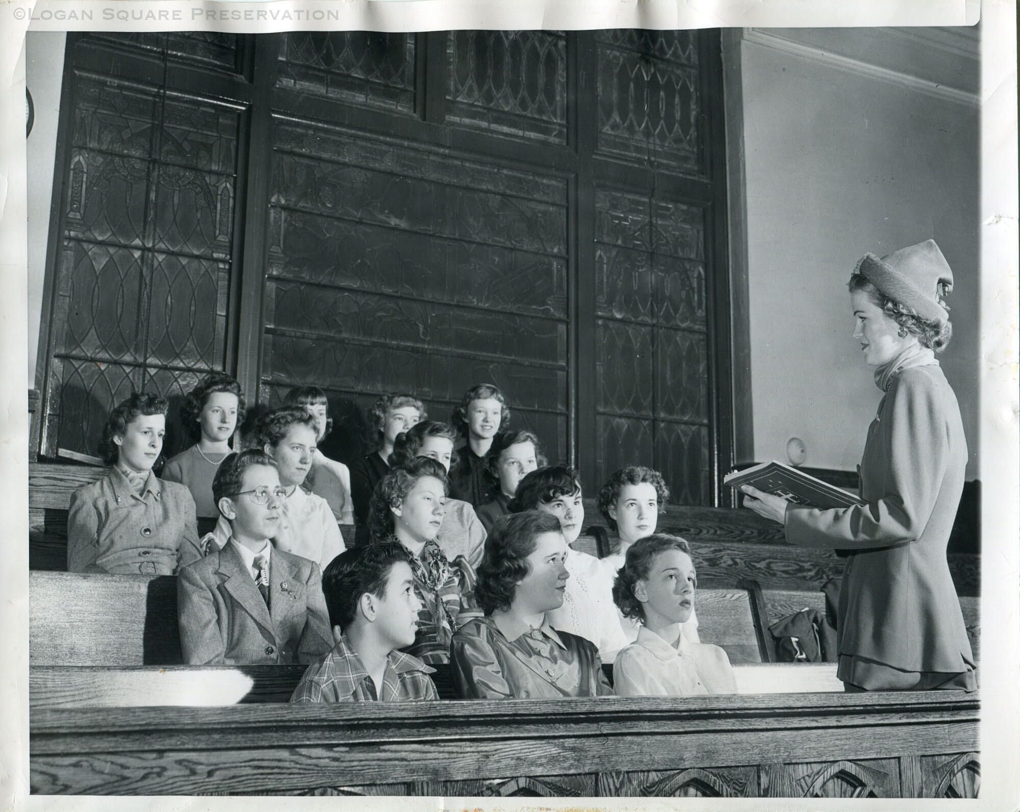 News photo of Sherry Hoff, fashion model and pastors wife, teaching young Sunday School students in balcony pews in front of large stained-glass window, February 1, 1950Photograph Details
