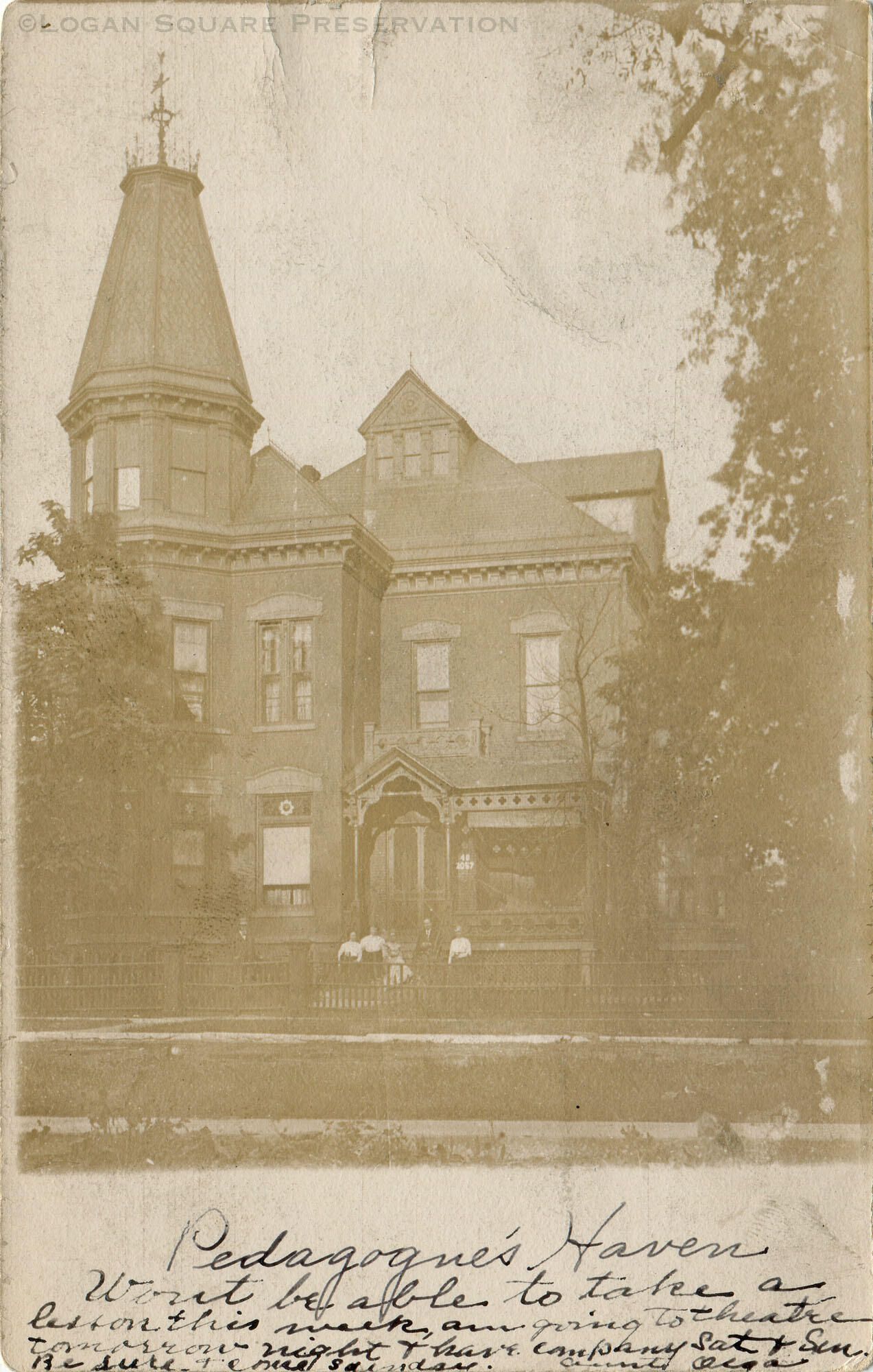 Real-photo postcard view of people standing in front of mansion with octagonal tower at unknown location, circa 1910Dimensions