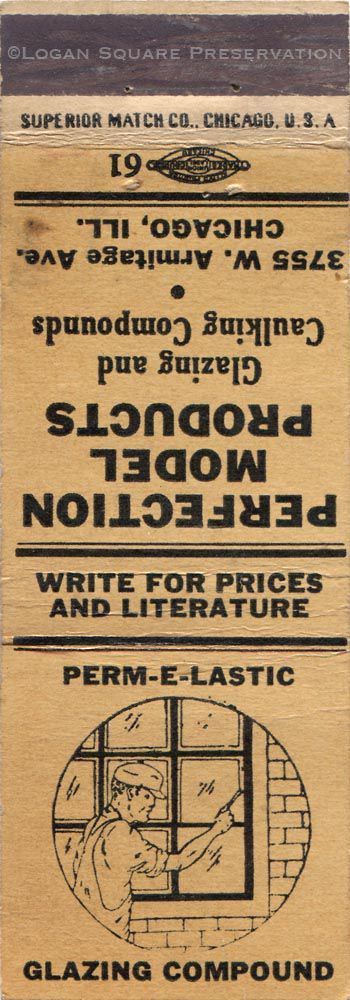 1.5" matchbook cover printed in black ink with illustration of glazier installing Perm-E-Lastic window caulking on back, circa 1930sPublication Details