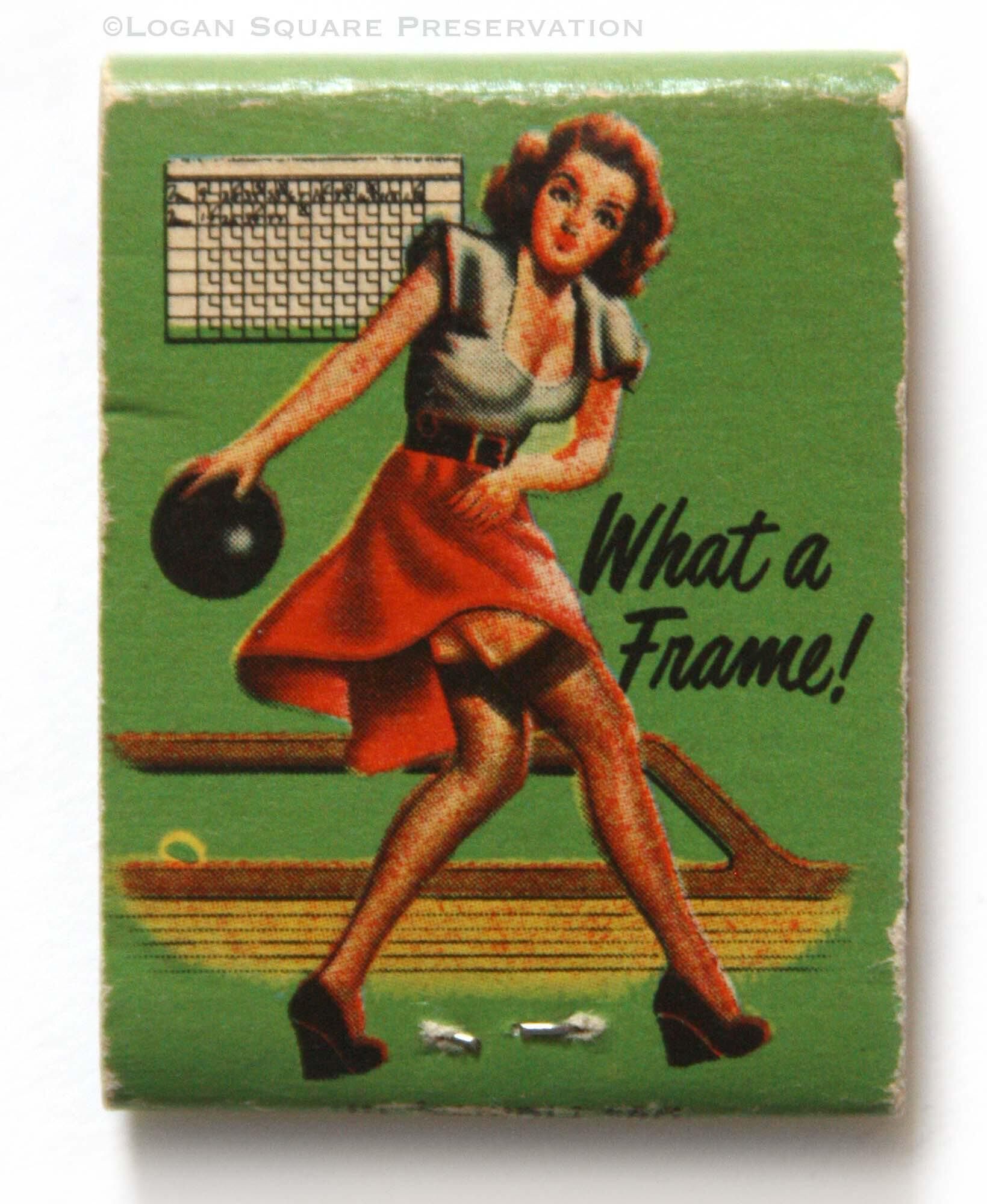1.5" matchbook on green background with stock image of pinup bowler labelled "What a Frame!" , circa 1940sPublication Details