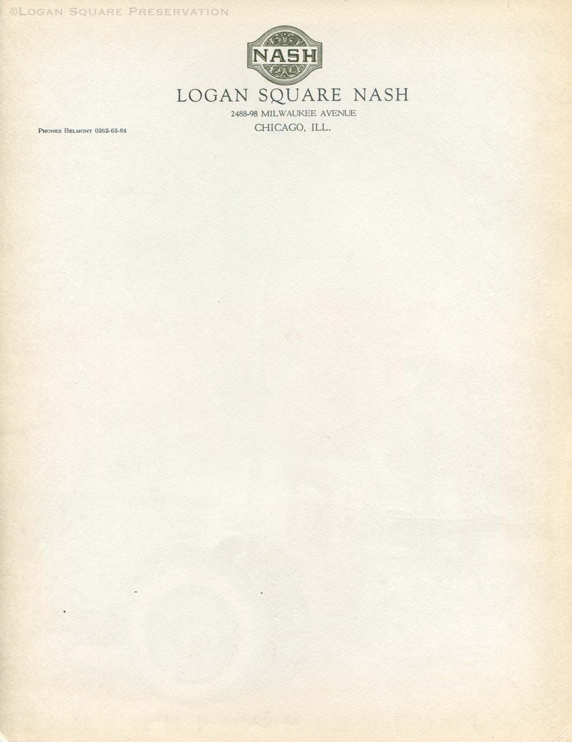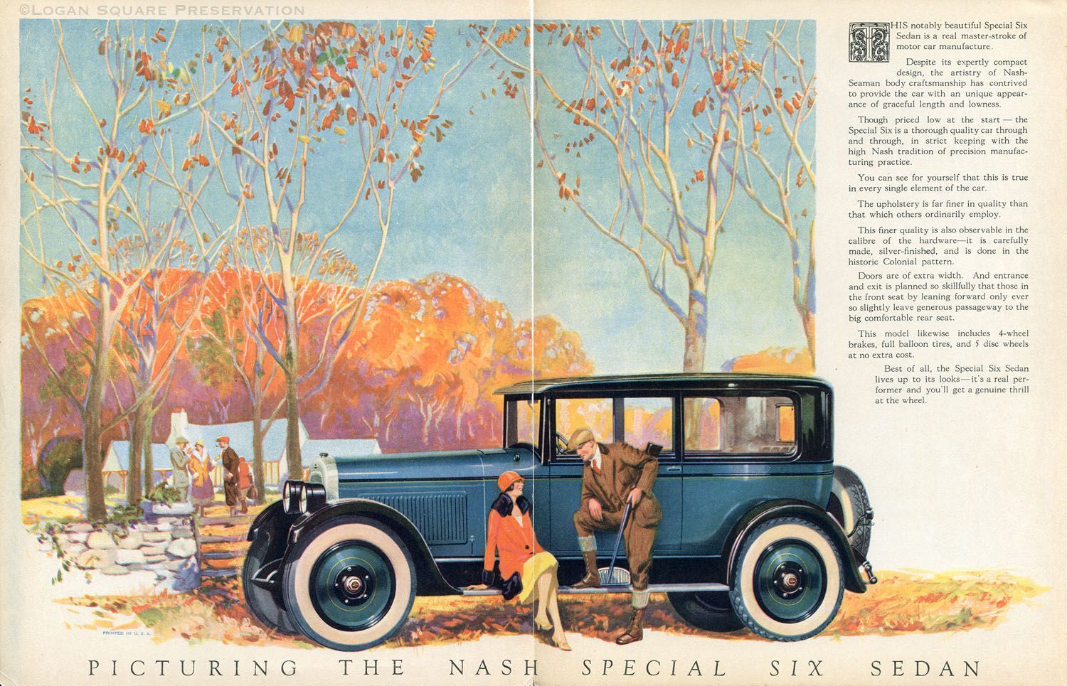 Two-panel 11" x 17" brochure with color illustration of Nash automobile in autumn scene on inside and Logan Square Nash dealer letterhead on outside, circa 1925-1929Relationships