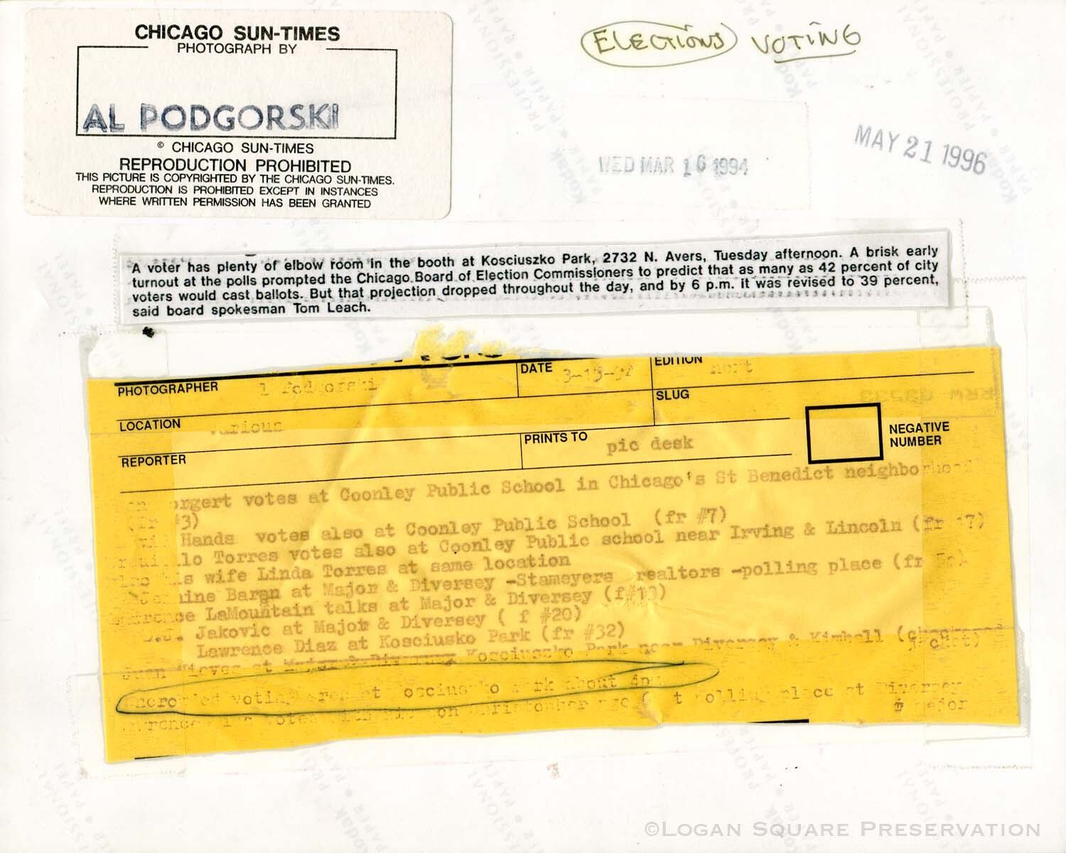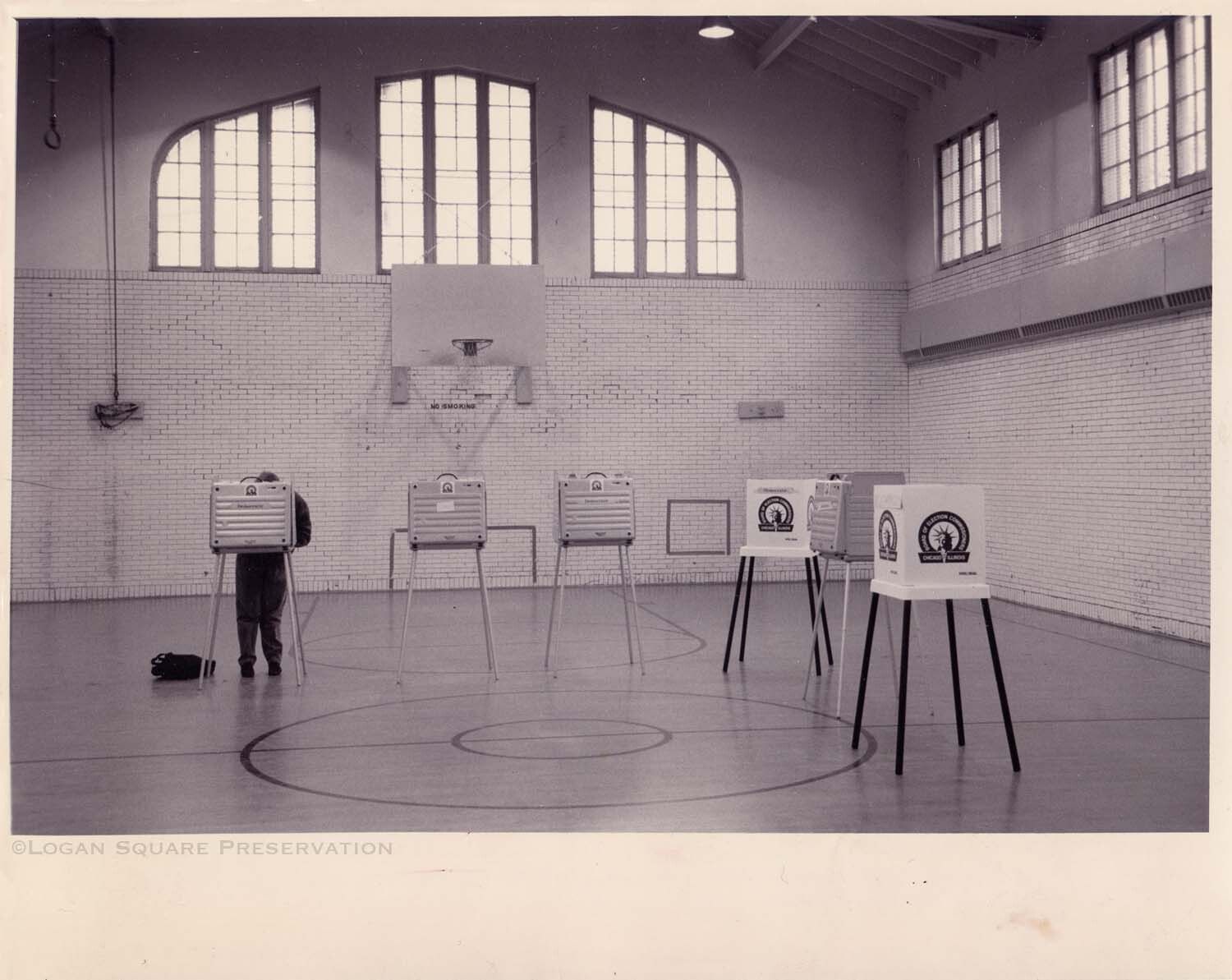 News photo of lone voter at voting booth on 39% turnout election day afternoon in Koz Park field house basketball court, March 1994Photograph Details