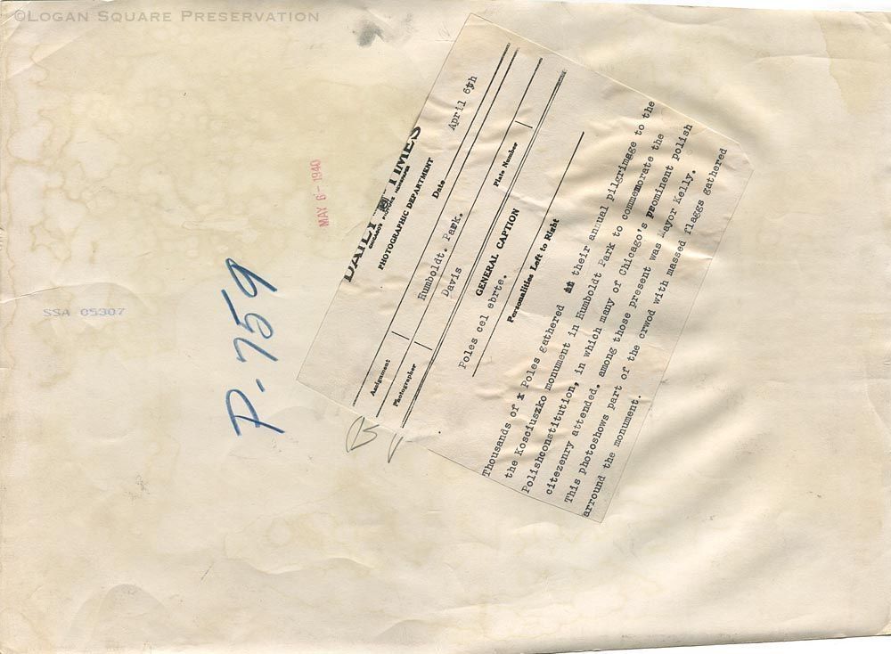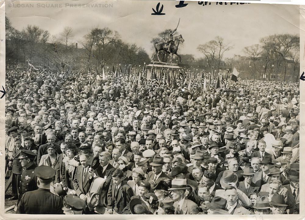 News photo looking out on crowd of tens of thousands gathered to hear speeches by Mayor Ed Kelly and others on wartime situation in Poland after march from Milwaukee & Division to Kosciuszko monument in Humboldt Park celebrating 149th anniversary of Polish Constitution, May 1940Photograph Details