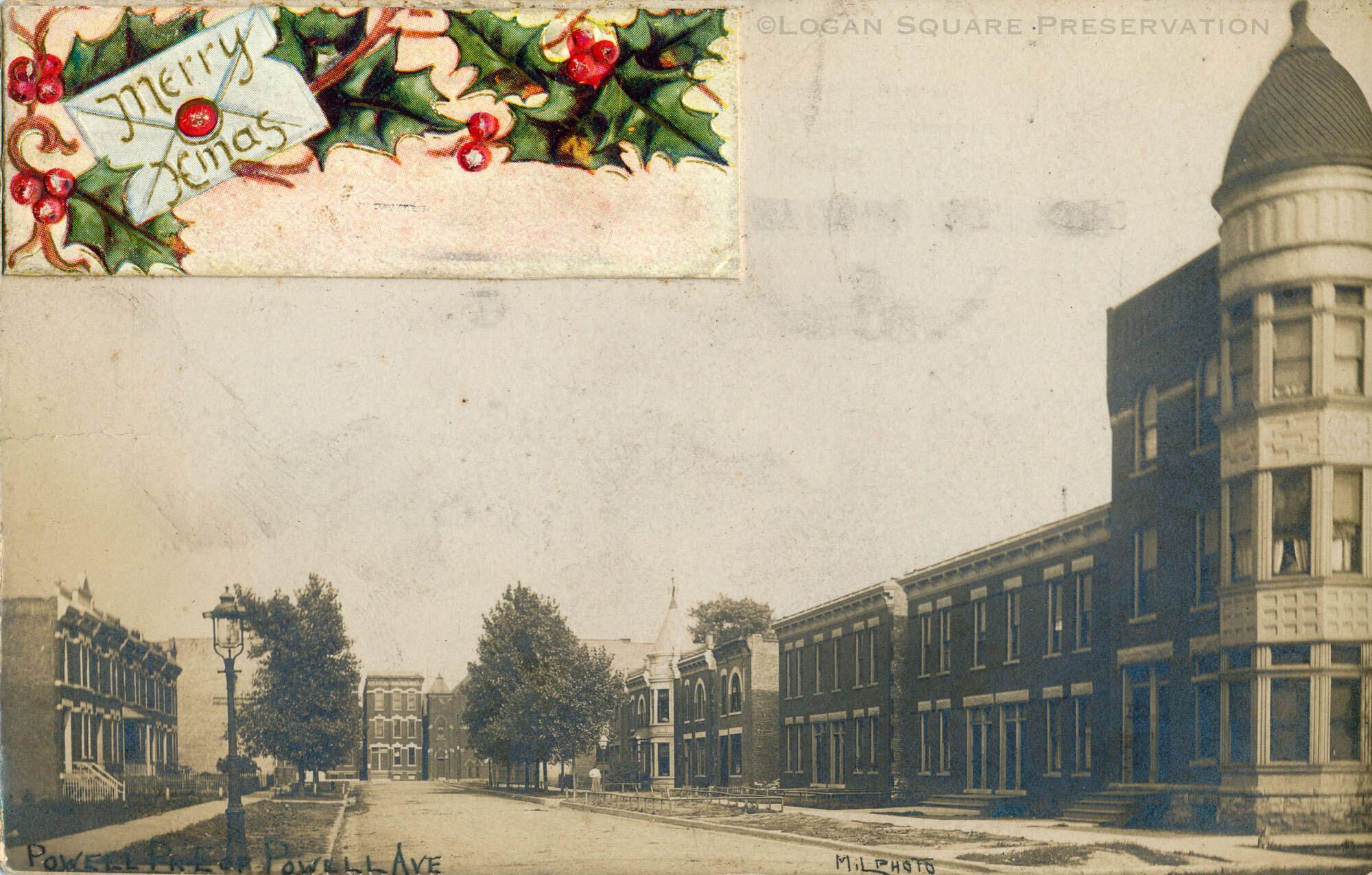 Real-photo postcard view looking east at 3-story corner apartments with tower and brick rowhouses on 2400 block of W. McLean Ave (formerly Powell Park), with Christmas label. Sent by Alice & Adele Duttweiler, Dec 26, 1908Subject
