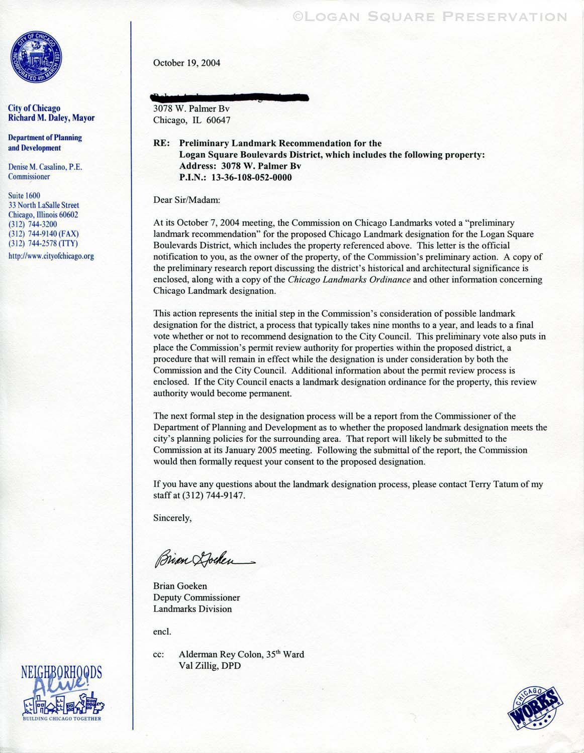 Cover letter of materials sent by Chicago Department of Planning to homeowners in proposed Logan Square Boulevards District, Oct 2004Collection
