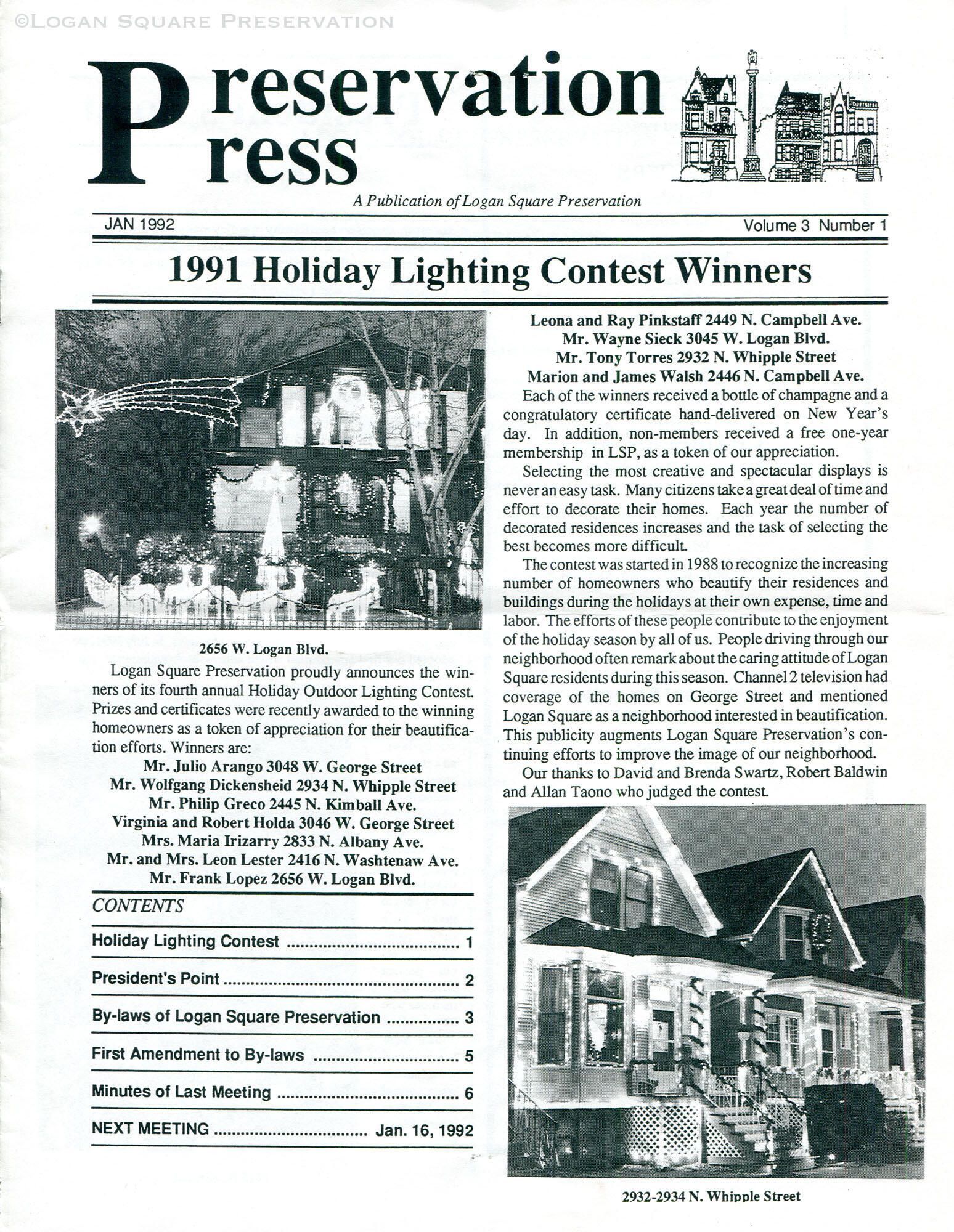 8-pg stapled newsletter for Logan Square Preservation with cover story about 1991 Holiday Lighting Contest winners, January 1992. Includes publication of LSP by-lawsCollection