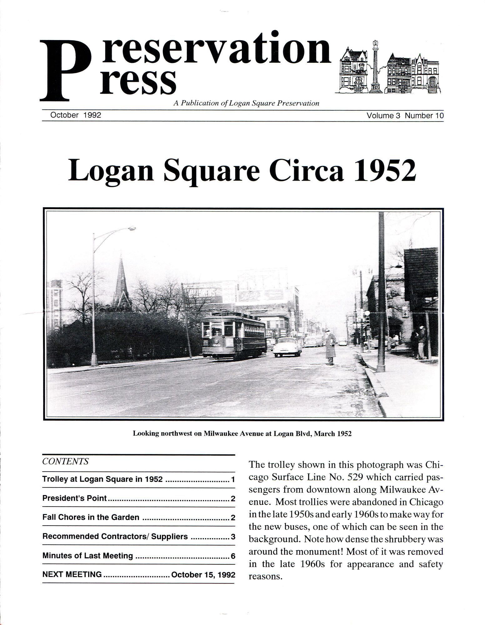 8-page staple-bound monthly newsletter of Logan Square Preservation with cover story about March 1952 photo looking northwest up Milwaukee Ave at Logan Blvd, October 1992Collection