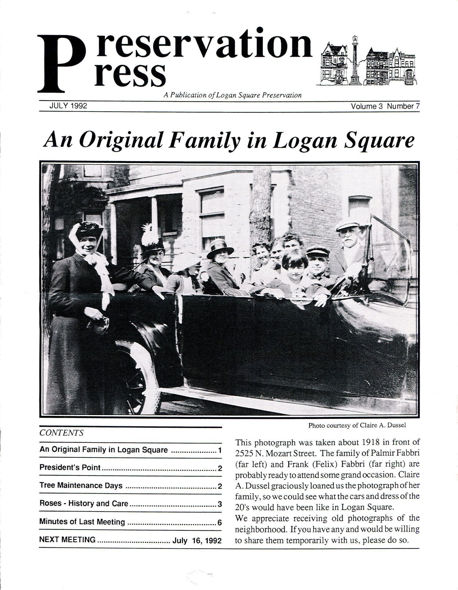 8-page staple-bound monthly newsletter of Logan Square Preservation with cover story about 1918 photo of Fabbri family, July 1992Publication Details
