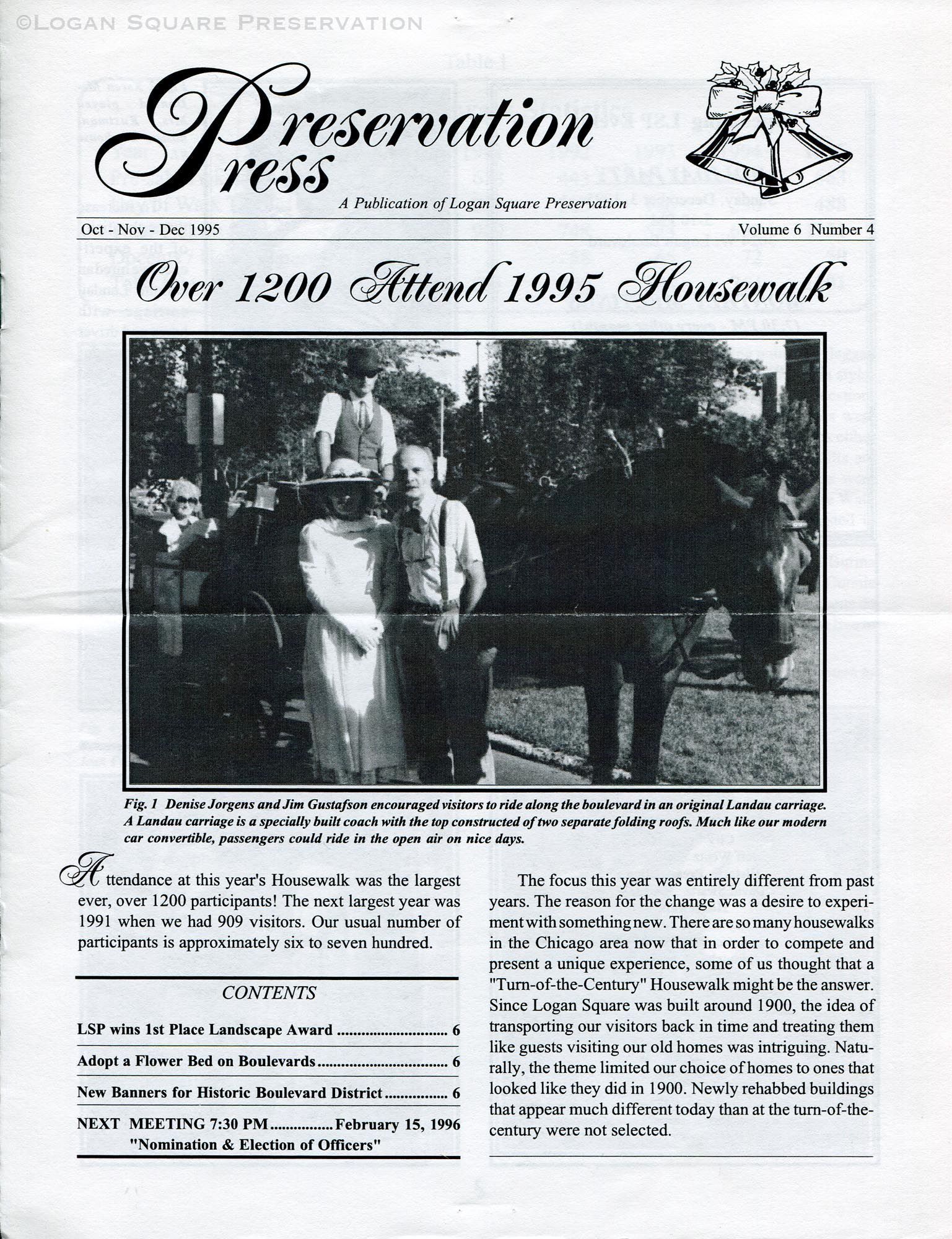 8-pg stapled newsletter for Logan Square Preservation with cover story report about fall Housewalk and photos of costumed docents, October-December 1995Collection